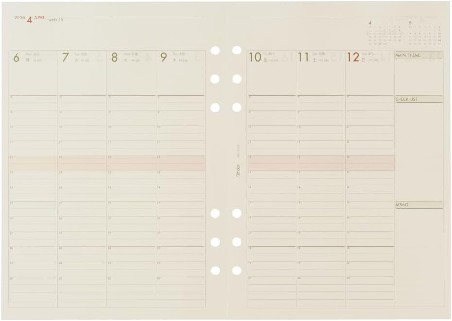 A5 Size: Vertical type that allows you to manage time in 30 minutes increments. Personal organizer refill with weekly main theme and checklist Diary refills beginning April 2026 are discontinued. We hope that you can consider the "January 2027 Edition Diary Refill" which is scheduled to be released in September 2026