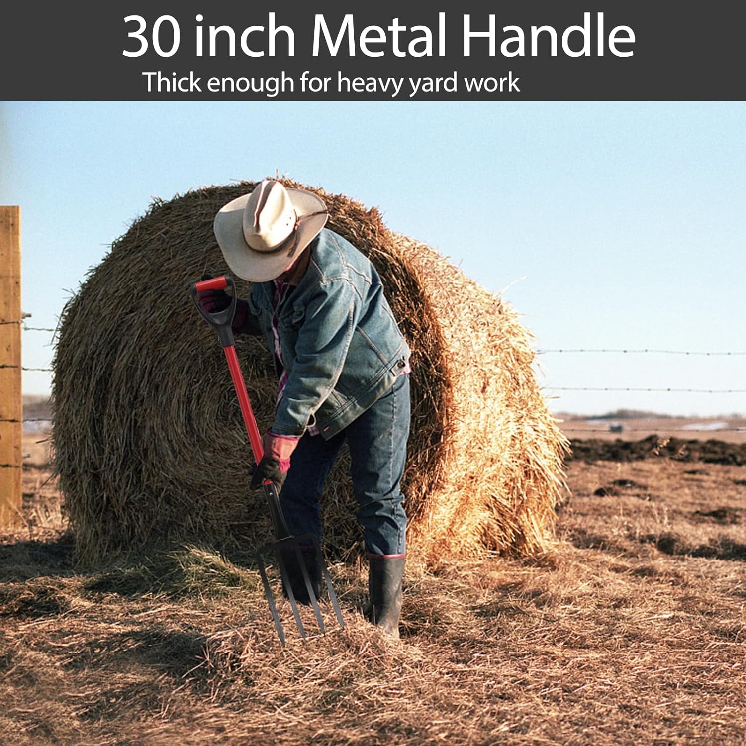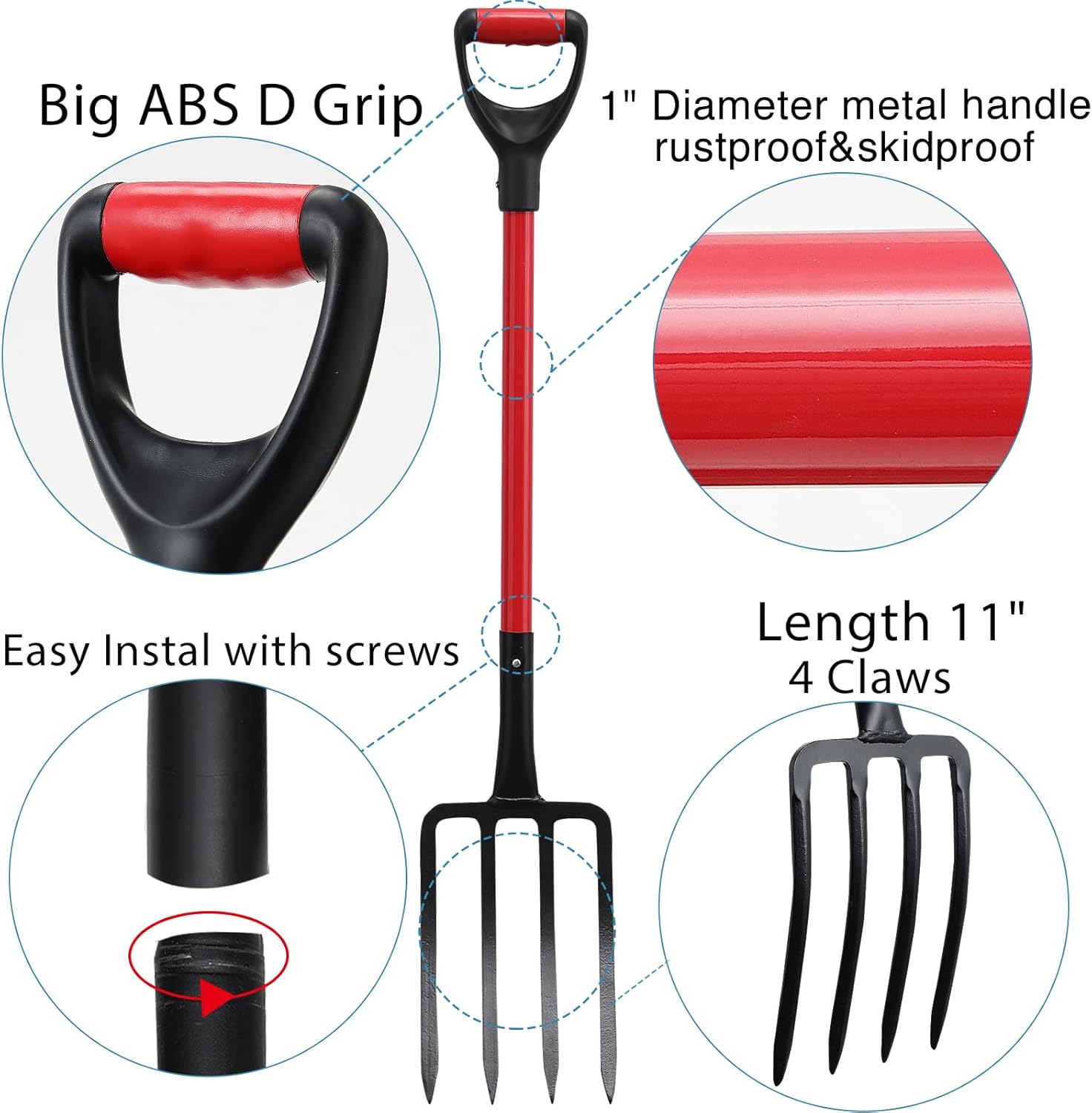 Metal Garden fork for garden digging Fork Broad Fork 4-Claw head depth : 11" 4-Claw head width : 7" D grip inner width: 3" Product Total Length: 40" Pole Diameter: 1 1/4" Pole Material: Rustproof Steel 4-Claw head Material: Rustproof Steel Material of Handle Top: Sturdy Plastic Assemble Required: All tools are provided