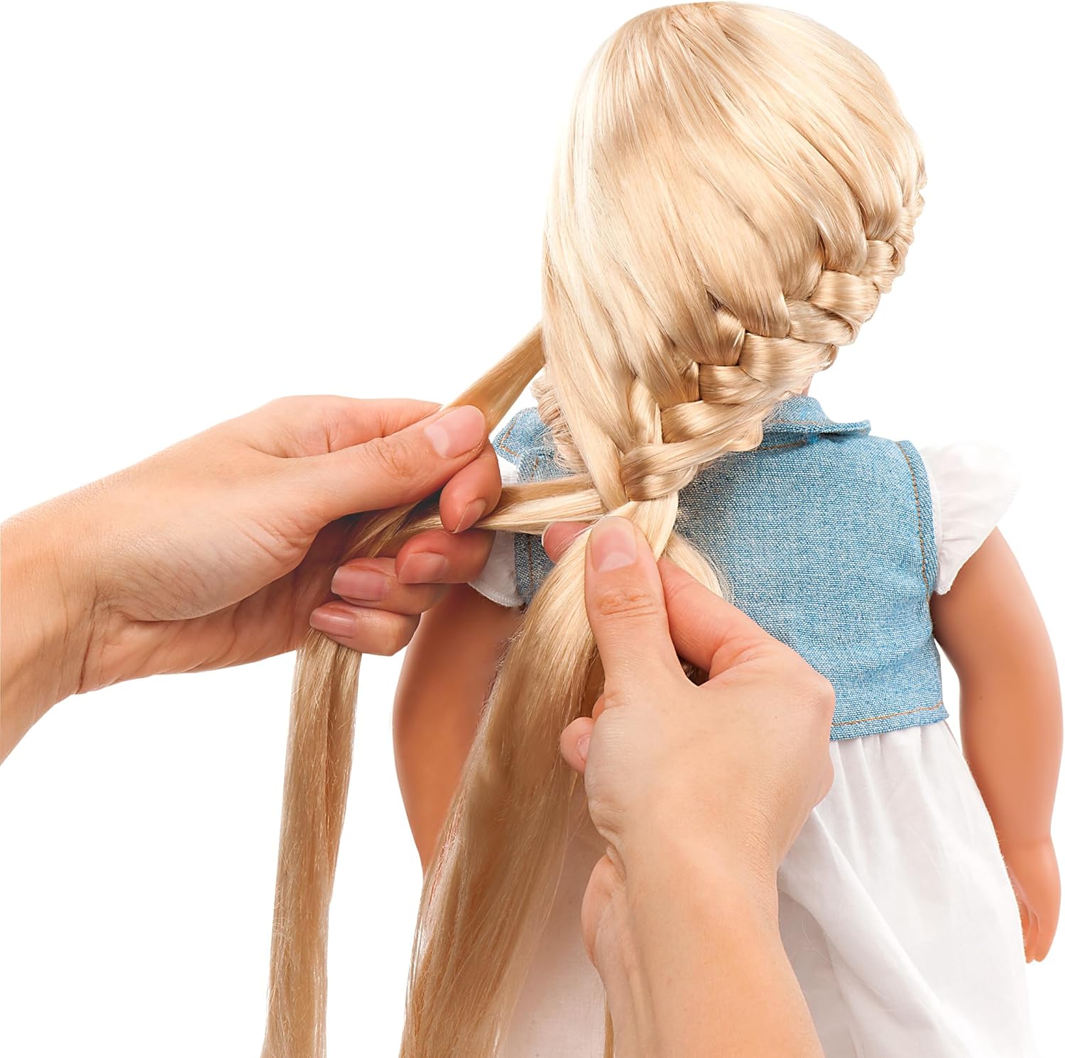 Let your imagination run wild with the Our Generation From Hair to There doll Phoebe! This lovely 18-inch doll has hazel eyes that open and close with long (really long!) light-blonde hair that’s lots of fun to brush and style! She arrives wearing a cool white dress, a stylish denim vest, and casual shoes. Phoebe is the perfect doll for you to bring your hairstyling creativity to life. Comb her soft straight hair to keep it neat and get rid of any messes or tangles. Then make braids, ponytails, pigtails, or other styles that tie into your imagination. You can even use the styling booklet for inspiration! How many hairstyles do you think you can come up with for Phoebe? (Additional outfits sold separately)