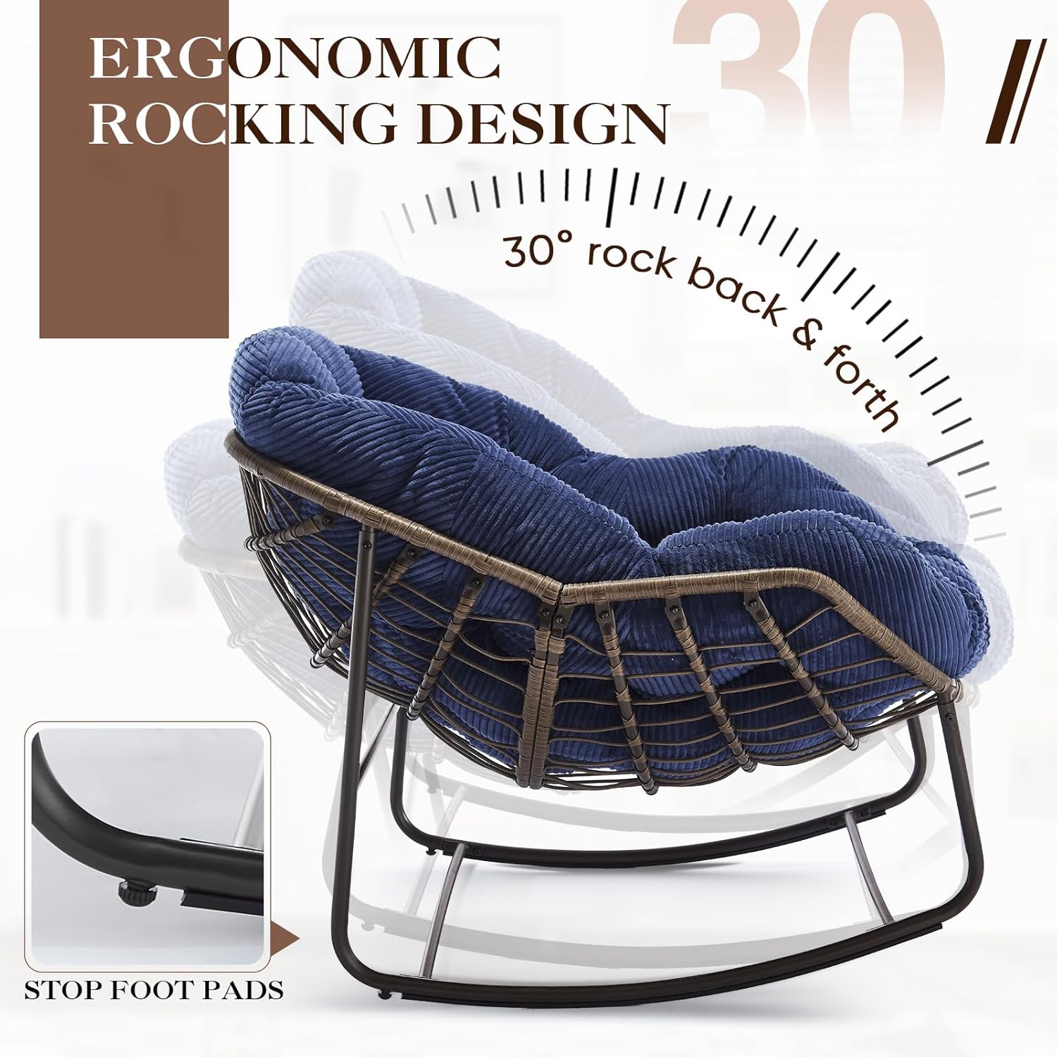 Features:➤ The egg-shaped silhouette design is paired with a quality cushion to create our elegant and stylish modern rocking chair. Such a simple and atmospheric appearance makes the lounge chair eye-catching anywhere.➤ The comfy chair rocks forward and backward no more than 30 degrees, smooth rocking provides better comfort, and no need to worry about rollover.➤ The curve of the porch chair is ergonomically designed and fits your body curve well. Lying on it will give you a good sense of wrapping, and the wider cushion allows you to fully relax your body.➤ Selected corduroy material and quality cushion make this outside rocking chair very soft; the greater resilience makes it more durable and not easy to deform.➤ Made of sturdy stainless steel and PE rattan, the base is both stable and durable, and can easily hold 350 LBS. The steel surface is powder-coated to resist water and sun, making our wicker rocking chair last longer.Specifications:Product Dimensions: 43.70"D x 37.20"W x 31.50"HMaximum Weight Recommendation: 350 LBSFrame Material: Steel+PE RattanRecommended Uses: Lounge, Living Room,Bedroom,Office