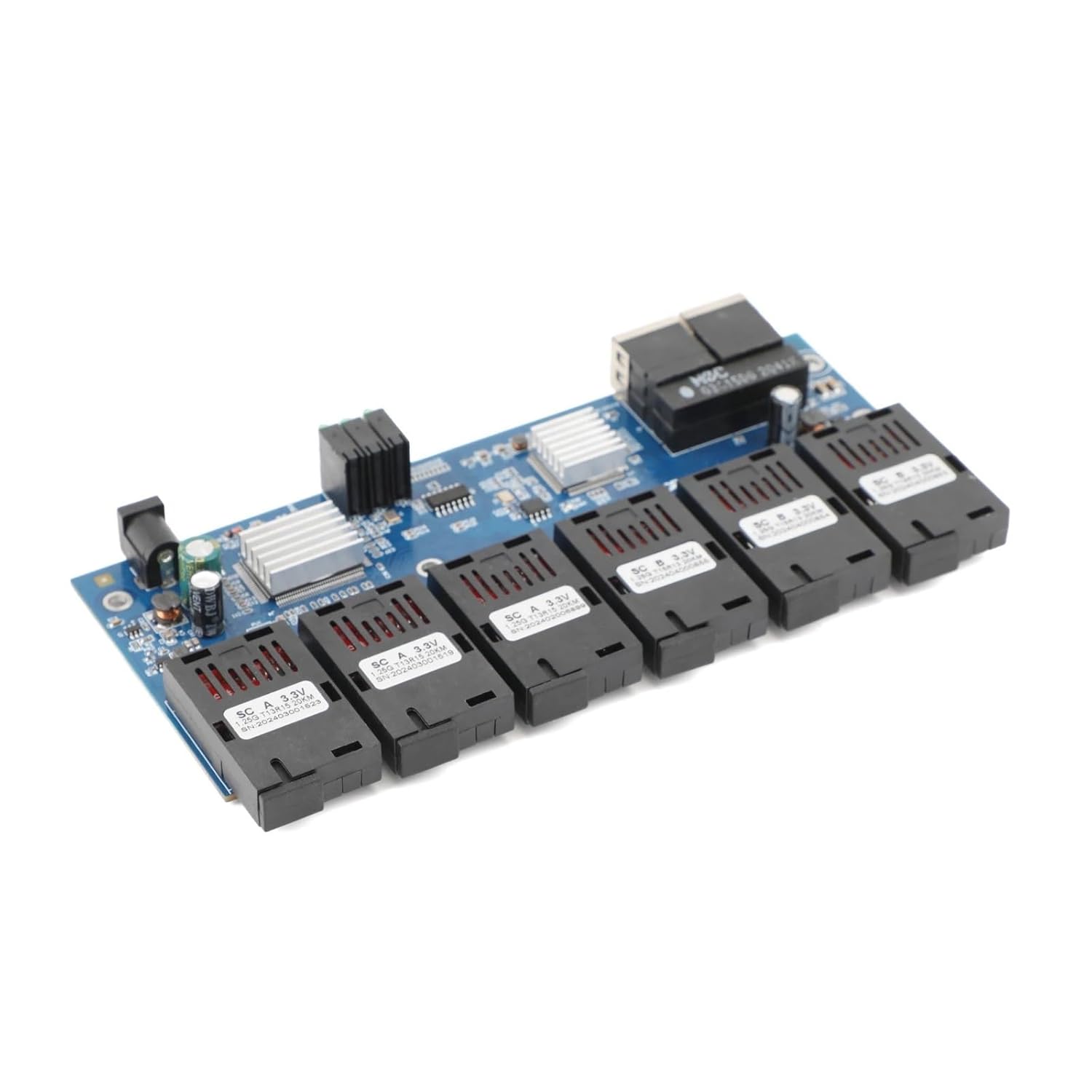 Digital to Analog ConvertersPCBA Board 1000M/100M Fiber Media Converter 2 RJ45 to 6 SC 3A+3B Ports 1.25G Connector 1310nm/1550nm 20KM Ethernet SwitchType: Optic Media ConverterSubject Type: PCBA BoardConnector A: 6 SCConnector B: 2 RJ45Distance: 0-20KMRJ45 Port Rate: 10/100/1000Mbps(Self-adapting)Optic Interface: SC Single FiberFiber Optic Port Rate Fiber: 6*1.25GWavelength: 1310/1550nmFeatureThe 1000M Ethernet Media Converters are designed to transmit and receive 10/100/1000Mbps data over optical fiber.The electrical interface will Auto-Negotiate to a 100Mbps or 1000Mbps Ethernet rate without any adjustments.The optical interface operates at a 1000Mbps Ethernet rate.Both are environmentally hardened to operate in extreme temperatures.LED indicators are provided for confirming equipment operating status.Only optic converter, no power adapter.The Quantity As Your Choice!!Note: Due to the nature and measurement tools, coupled with the purely manual measurement and cutting of the cable, it may cause a length error of 1%-3%.==========High-concerned chemical : NoneTransmission distance : 0-20KMModel Number : 2 RJ45 to 6 SCConnector B : 2 RJ45RJ45 Port Rate : 10/100/1000Mbps(Self-adapting)Optic Interface : SC Single FiberConnector A : 6 SCSubject Type : PCBA BoardType : Optic Media ConverterFiber Optic Port Rate Fiber : 6*1.25GWavelength : 1310/1550nmDistance : 0-20KM