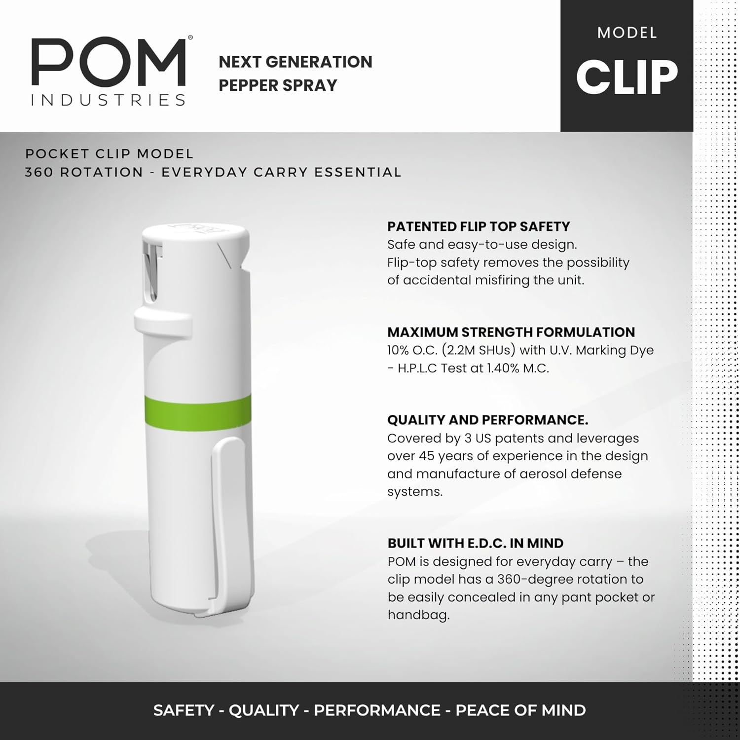 Intuitive, Compact, and Ready When You Need It Most. Stay protected with POM Pepper Spray—trusted by professionals and civilians alike. Designed with a patented flip-top actuator, POM’s intuitive system allows for quick, reliable use under pressure, keeping you safe when seconds matter. Our maximum strength OC formula offers police-grade stopping power and includes an invisible UV dye to assist law enforcement with suspect identification. Each compact unit delivers 25 powerful bursts in a precise stream spray that minimizes wind blowback and reaches distances up to 10–12 feet, providing safe, effective protection from multiple threats. The ergonomic design ensures proper hand alignment by feel alone, so you can stay focused on the situation—not your grip. Whether clipped discreetly to a pocket or carried on a Quick Key Release, POM is made for easy access and daily carry. Available in a range of sleek, modern colors. POM — Protection in the Palm of Your Hand. Proudly made in the USA.