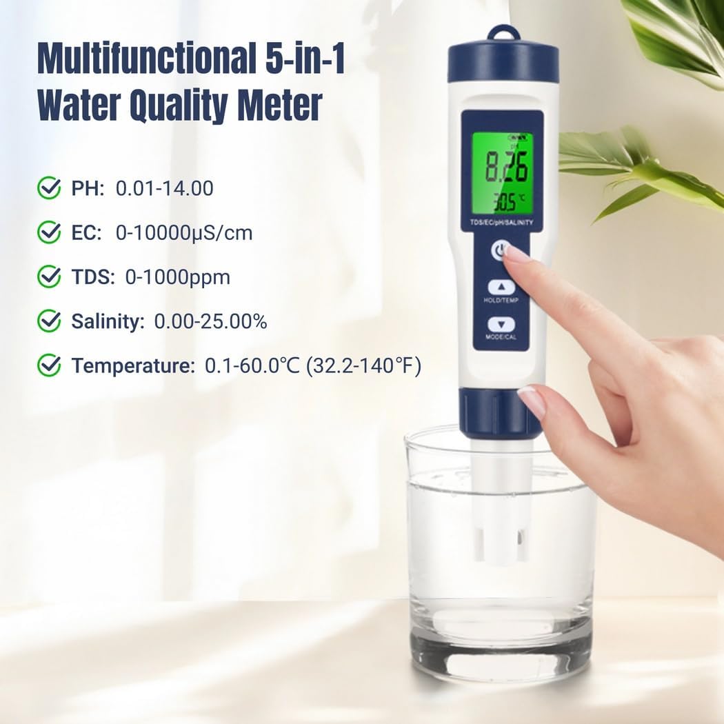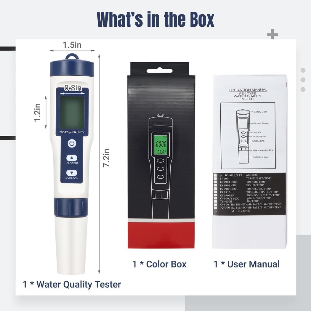 Color: Dark Blue Material: Plastic Tester Size: 7.2 * 1.5 * 1.5 inches Package Includes: 1 * Water Quality Tester, 1 * User Manual, 1 * Color Box Note: - Please refer to the measurement. Tiny measuring error is allowable in normal range. - There might be a little color difference due to the monitor, camera or other factors, please refer to the physical item.