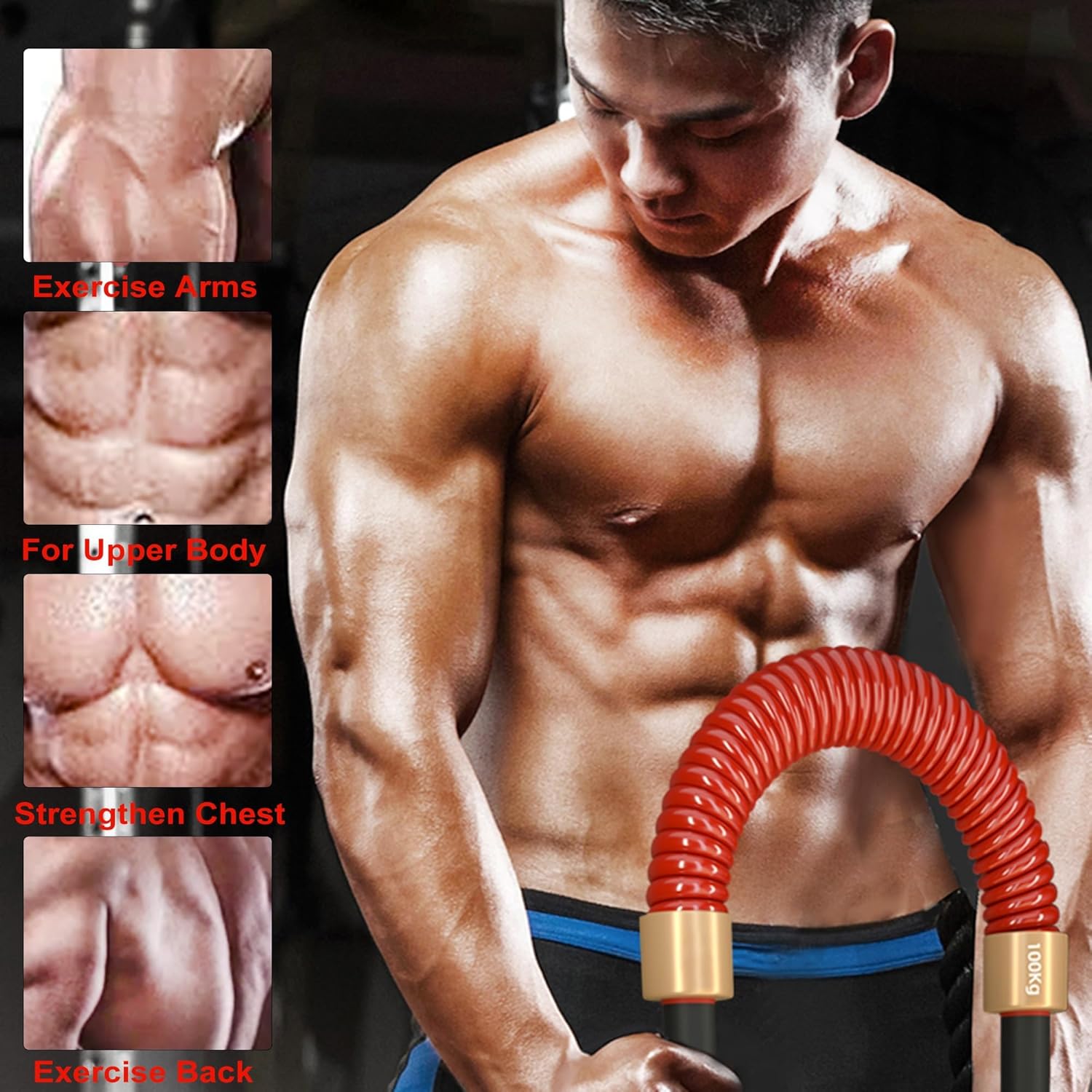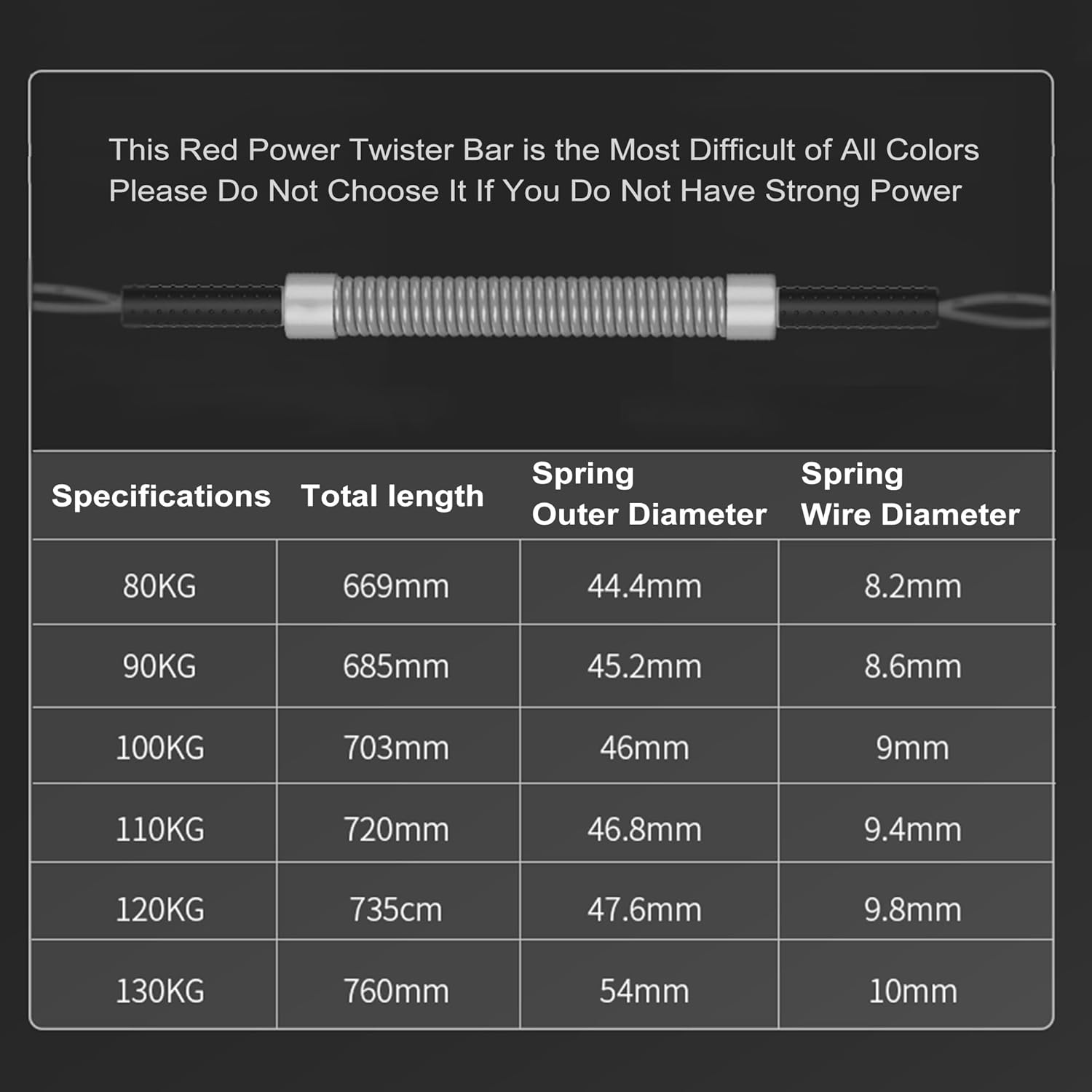 💪This Power Twister Bar is very demanding on the user's strength, and is only suitable for fitness people who can easily use the orange MAX140kg- Power Twister Bar💪You need to warm up wrists and shoulders before using. 💪can forearms, biceps, chest, Arm, and shoulders Color: Red, golden red, green, golden black,Material: Stainless steel tube, double metal spring, rubber handleVarious Weights Available: 130kg, 150kgSuitable for People: adults, fitness enthusiasts and coachesApplicable Scenarios: home, gym, work, travelWarm Notice: 1. Whether you are a beginner or an experienced fitness enthusiast, if this is your first time using this equipment, please choose the strength you can use and take a gradual approach to the intensity.2. If you receive the item and it's too hard to use, you can choose to hang a dumbbell underneath, which will make it much easier.What's in the package:Power Twister Bar x1, Storage Bag x1
