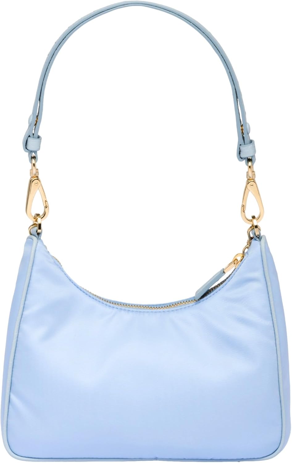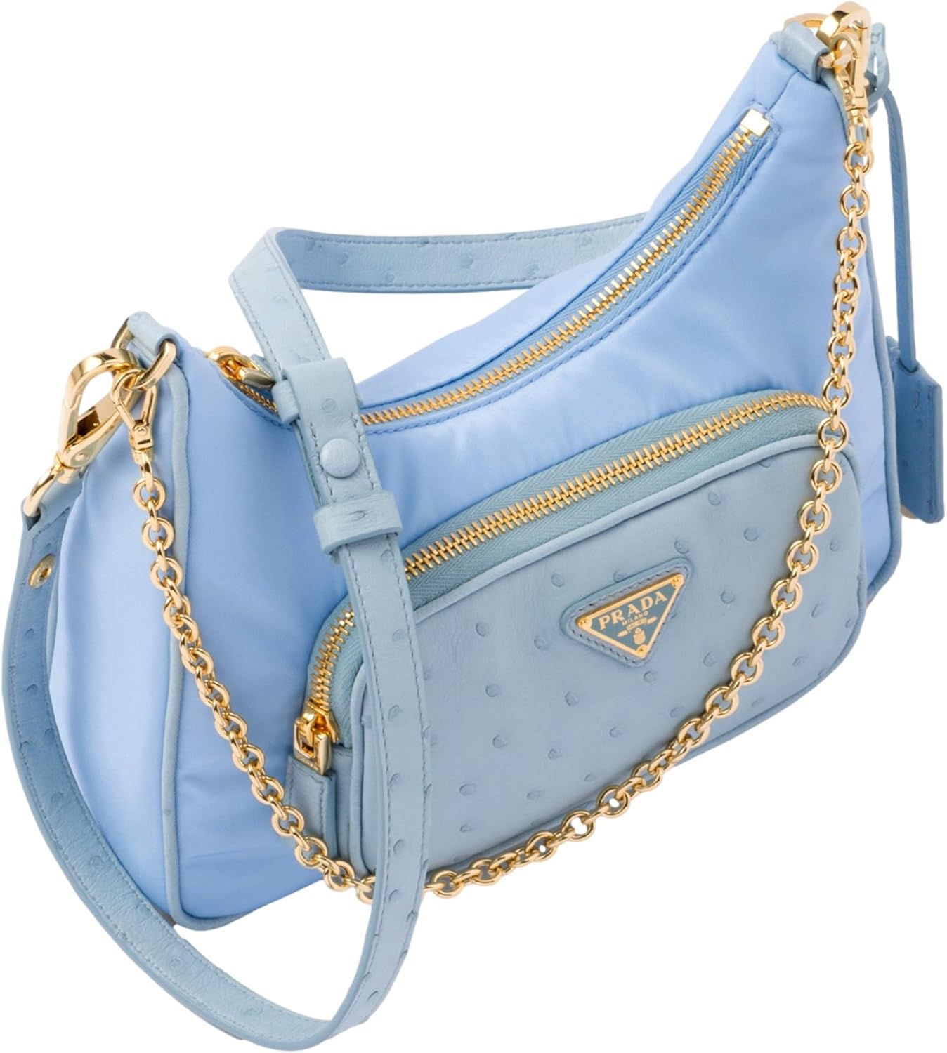 Prada Womens 2Way Tessuto Nylon Cielo Blue Ostrich Leather Luxury Shoulder Handbag | Triangle Prada Logo