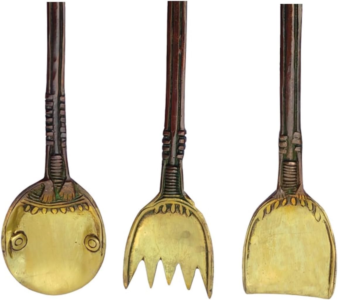 A beautiful unique concept in decorating your walls. Use this antique brass tribal cutlery set to hang on your walls for that medieval touch. One end of the spoon/spatula/fork is shaped as a cutlery while the other end has a tribal face with a loop. Ideal to hang in the kitchen / dining area. A unique gifting option.