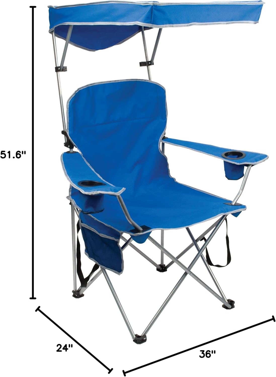 Quik Shade Full Size Shade Folding Chair, Royal Blue, 2'L x 3'W x 4.3'H (160048DS)Get this full size portable chair with adjustable canopy. A comfortable, portable folding chair made from a sturdy steel frame and moisture resistant fabric. Bring a seat anywhere. Comes with a convenient, portable carry bag.Quik Shade MAX Shade Chair, BlueRelax and kick back while you shield yourself from the sun with the Quik Shade MAX Shade Folding Chair. Quik Shade's Max Shade Chair is compact, portable, and comfortable. Our patented Quik Shade shade chair is a great portable shade chair solution that offers reliable sun protection that's easy to transport. A rugged fabric carry bag is also included for convenient portability and storage. The patented design allows the sun shade to raise, lower, and tilt to block the sun from any angle, without leaving the comfort of your chair. With the new MAX Shade design, you get 40% more shade making this a great chair to take with you on your next outdoor adventure. The tough 600 x 300 denier polyester fabric is water, moisture, mold, mildew, and stain resistant, and can easily be wiped clean. The chair back has a higher arch and is also constructed from breathable mesh that lets air flow through to help keep you cool while you relax. With the convenient mesh storage pouch on the side, you can keep your snacks, cell phone, or accessories close at hand. Stay hydrated on those hot summer days outside with dual cup holders and lounge around in the superior comfort of the 22.5-inch, oversized seat that supports up to 500 pounds. SIZE: Open 22.8"L x 22.8"W x 51.6"H and seat is 18.5 inches from ground, and weighs only 9 pounds. INCLUDES: 1 folding camp chair and 1 carry bag