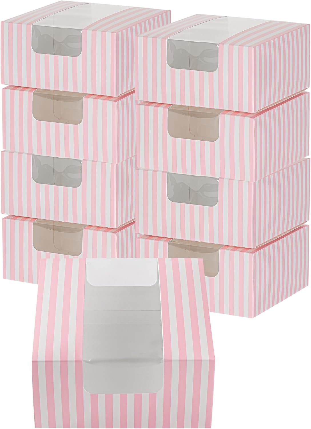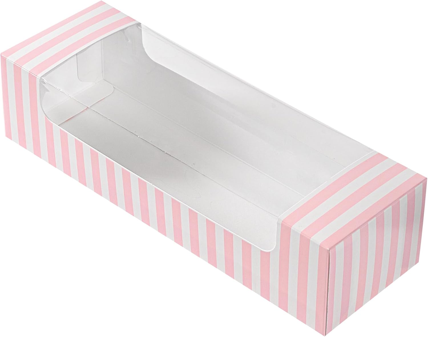 Present your delightful treats in a stylish manner with our Pastry Tek Pink and White Stripe Paper Pastry / Cake Boxes. Featuring a transparent window, these bakery boxes deliver superior visibility, enabling efficient display and effortless identification of desserts. Designed with impervious-to-grease properties, these pastry boxes ensure that oil leakage is a concern of the past. The sustainable feature of these pink and white striped paper cake boxes provides an easy solution to minimize waste in your establishment. With a charming striped design, these cake boxes elevate the presentation of your baked goods. Conveniently shipped flat, these treat boxes save storage space and simplify assembly. Each paper treat box measures 9.8 inches in length by 3.3 inches in width by 2.3 inches in height. Sold in a 100 count box.