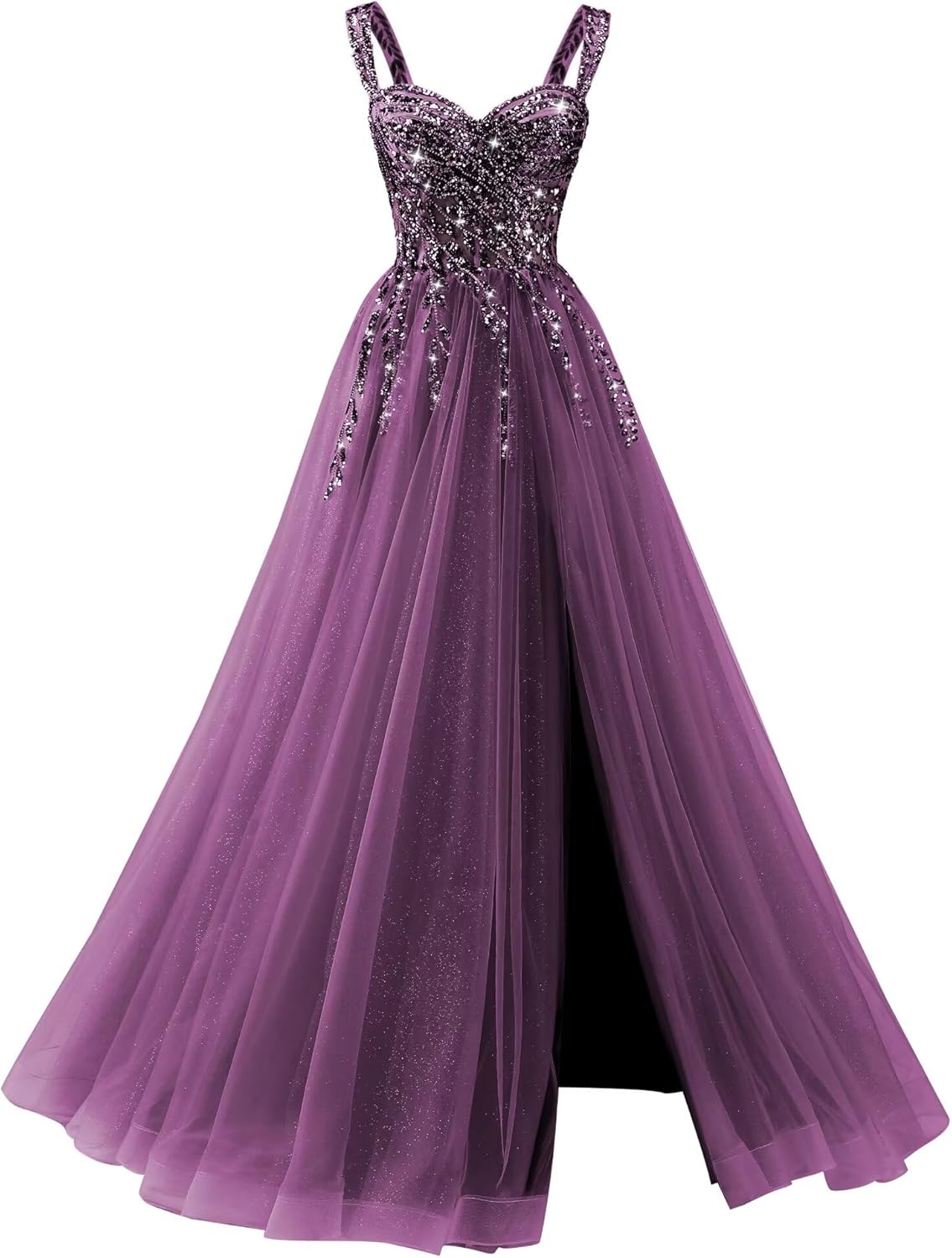 Welcome to Rjer Store This is a spaghetti straps tulle prom dresses, masterfully blending romantic and refined elements into its design. Fabric: Crafted from airy tulle, the gown creates an ethereal and gracefully flowing visual effect. Embellishments: The bodice is adorned with intricate details featuring extensive lace appliques and sparkly sequins. A lace-up open back adds an alluring and sensual touch. Silhouette: The spaghetti straps elegantly frame the neckline and shoulders, while the full-length skirt elongates and flatters the figure. This design is perfect for formal social occasions such as proms, galas, and upscale parties. How to choose size: Measure your body and compare it with our size chart. If you want a more accurate fit, please send us your measurements as follows: 1. Bust___inches 2.Waist___inches 3.Hips___inches 4.Hollow to floor ___inches 5.Height(without shoes)___inches