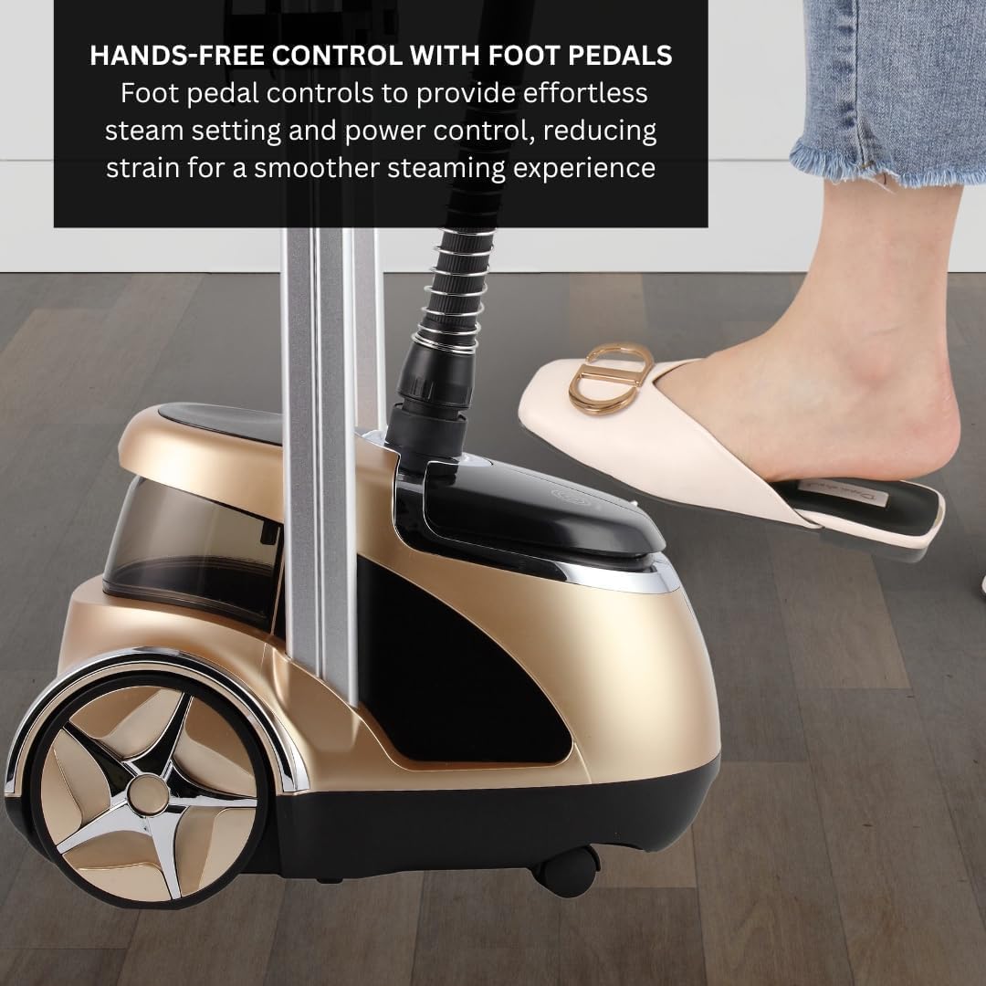 | Product Benefits | Efficient wrinkle removal with dual bar steaming, easy to use with foot pedals, portable with retractable cord, long steaming duration |