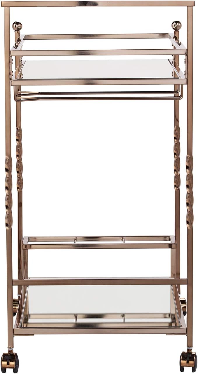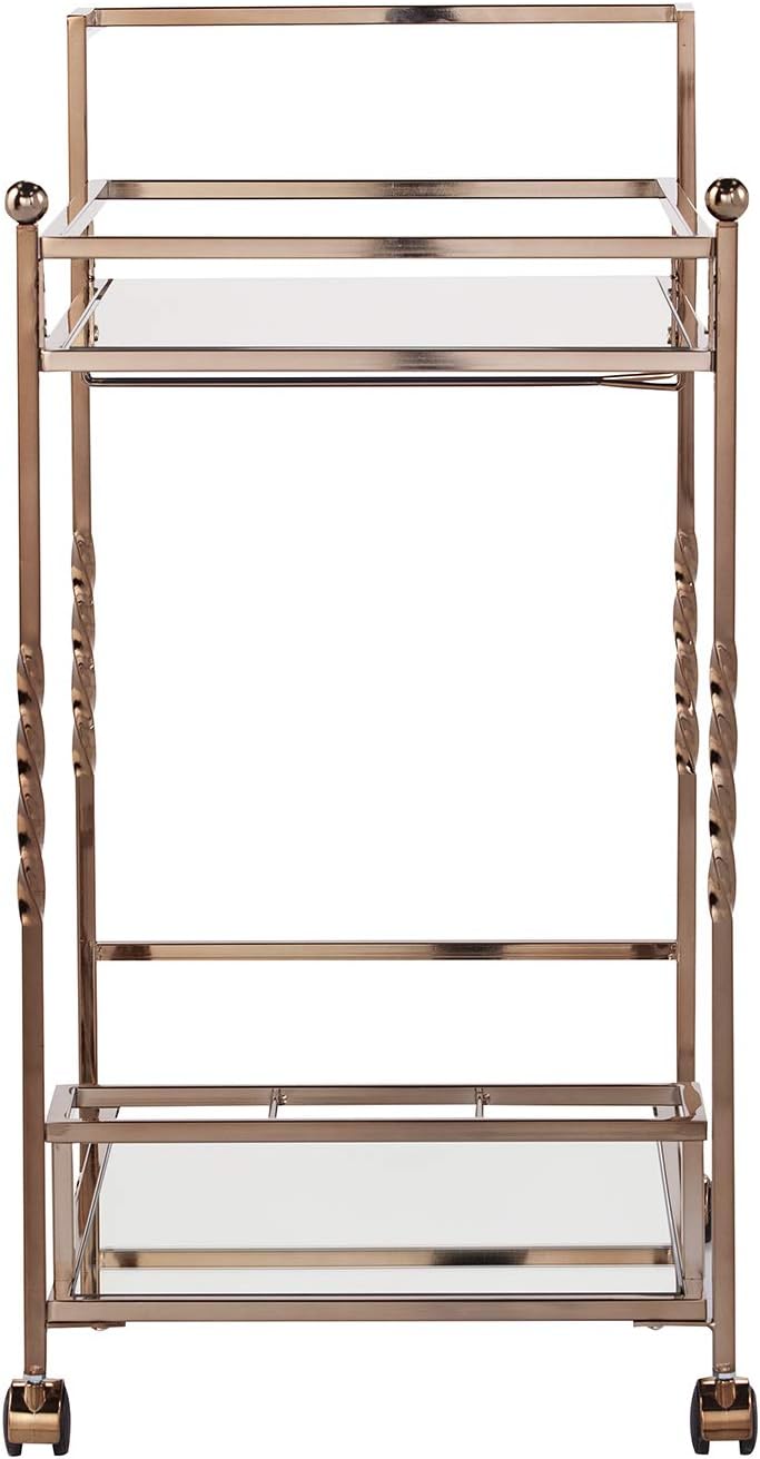 Stack up your style with this double-decker mirrored bar cart. Two mirrored shelves reflect your bar collection, while stemware racks and bottle holders keep your items easily accessible and neatly organized. A conveniently placed handle pairs with locking casters, ensuring fluid movement between various entertainment spaces in your dining area or open concept living space.