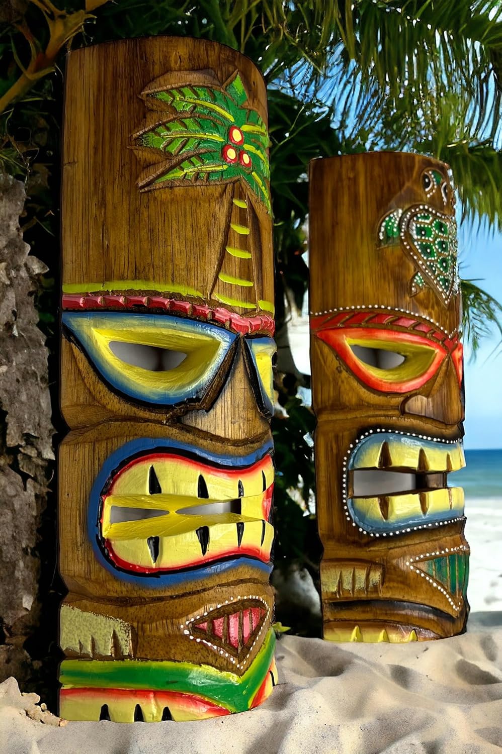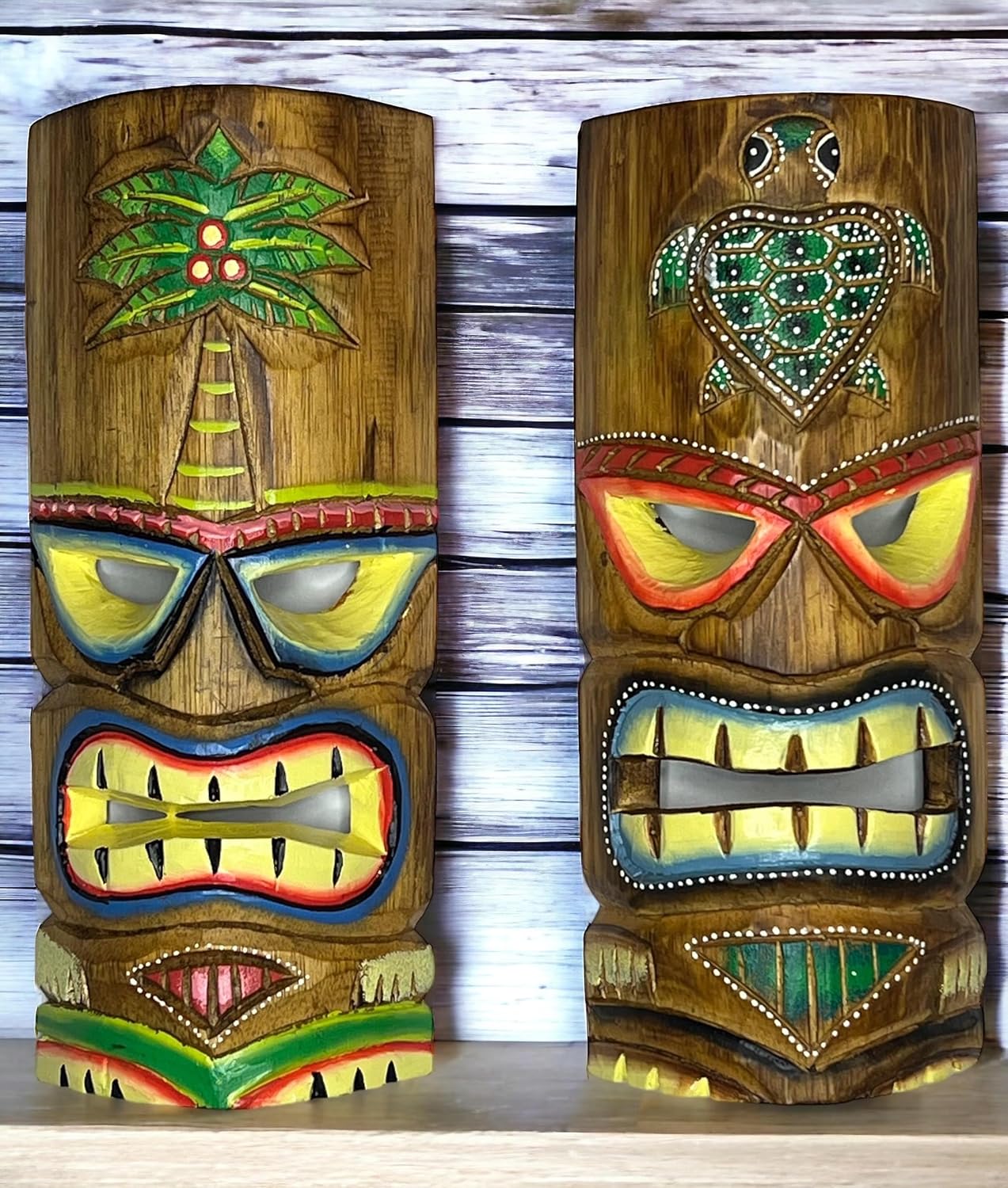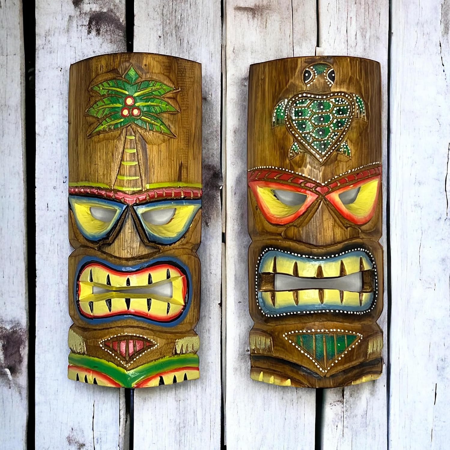 Bring the bold spirit of the tropics into your home with this stunning set of two hand-carved Tiki masks from Top Brass. Crafted from natural wood and intricately painted by hand, each piece tells its own story with expressive tribal features, vibrant colors, and unique tropical elements — one mask adorned with a palm tree and the other with a tribal sea turtle. These masks are designed to infuse your space with island energy, cultural artistry, and coastal flair. Whether you’re decorating a tiki bar, backyard patio, man cave, or beach house, these 12” tall masks are conversation starters and instant mood-setters. Each includes a built-in hanging loop for effortless wall mounting.