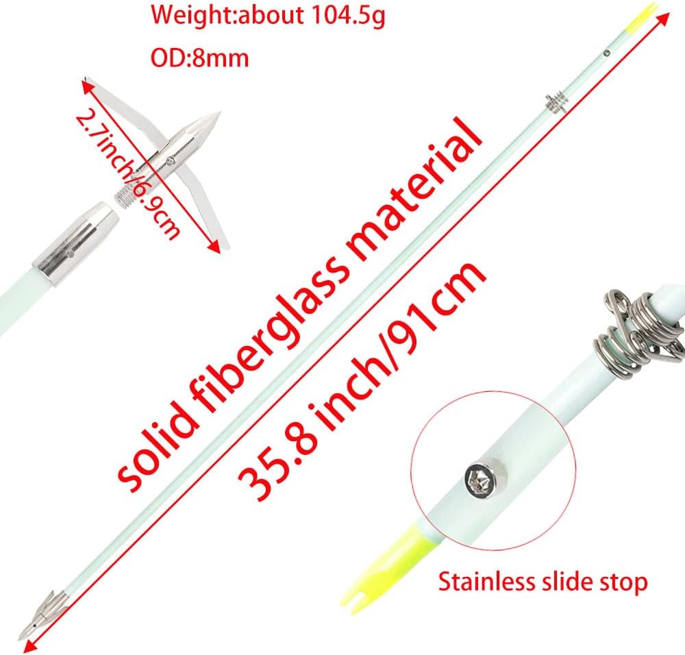 Item name: Fiberglass bowfishing arrow Material:solid fiberglass Total length: 35.8inch/91cm Standard length: 33.4inch/85cm OD:8mm Width of tip:6.9cm/2..7inch Weight: about 104.5g Package includes: 3/6x bowfishing arrow