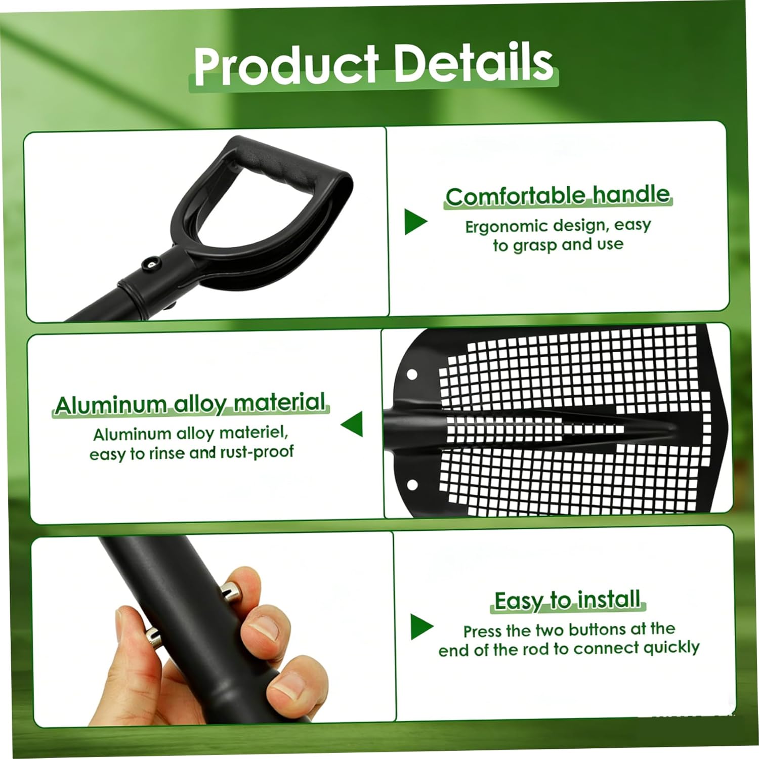 Description: Transform laborious sifting tasks into effortless routines with our Long Handle Aluminum Sifting Shovel. Its primary advantage is its lightweight aluminum construction, which reduces strain during use, whether you're screening a large garden plot or walking the shoreline. The perforated head acts as a built-in filter, letting you quickly separate fine material from unwanted debris. No tools are needed for setup; the poles connect securely with a user-friendly locking mechanism, extending to a full 45 inches to minimize bending. When the job is done, the non-stick surface makes cleanup a breeze. This shovel is designed to adapt to your needs: use it to find hidden shells at the beach, maintain a cleaner by sifting out droppings, prepare fine soil for planting, or keep your child's play area free of hidden stones. Stable , practical, and easy to handle, it's a smart addition to any shed or garage. Features:. -Color: Black. -Material: Aluminium Alloy. -Size: Length: 115 cm / 45.3 inch. Note:Manual measurement, please allow slight errors on size.The colors may exist slight difference due to different screens. Package Including 1 * Sifting Shovel