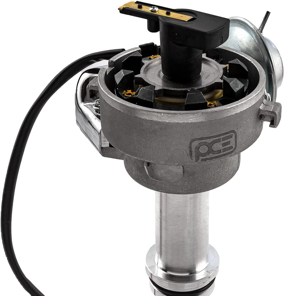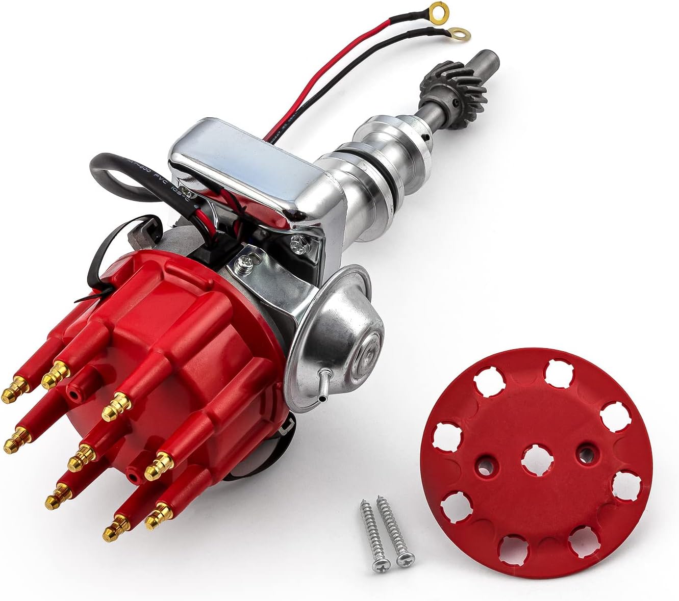Brand:SpeedmasterPart Number:PCE376.1083.01Part Type:DistributorComputer-Controlled Compatible:NoTrigger Style:Hall effectAdvance Type:Vacuum and mechanicalCap Style:Male/HEIMechanical Tach Drive:NoSlip Collar:NoGear Material:SteelIgnition Box Required:NoDistributor Gear Rotation:StandardDistributor Cap Color:RedHousing Material:AluminumHousing Finish:CNC MachinedMarine Use:NoQuantity:Sold individually.Notes:Includes Distributor and Internal Ignition all you will need is a Coil.