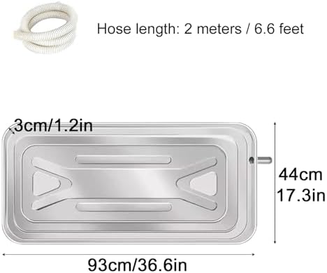 This essential accessory effectively prevents leaks, ensuring your floors remain dry and safeguarded from potential water damage. Whether for indoor or outdoor units, it offers a versatile solution tailored for any environment.Crafted from high-quality stainless steel, our drip pan promises exceptional durability and long-lasting performance. The advanced molding process enhances its structural strength, while the innovative side water outlet design allows for easy drainage, eliminating unwanted pooling. Available in three convenient sizes to fit various air conditioning units:- 1-2P: 84x38x3cm (33x15x1.2in)- 3P: 93x44x3cm (36.6x17.3x1.2in)- 5P: 100x47.5x3cm (39.4x18.7x1.2in)Each package includes one Air Conditioner Drip Pan, a 2-meter (6.6 feet) drain hose, a fixing clamp, and a rust-proof iron wire, equipping you with everything necessary for a swift and simple installation.