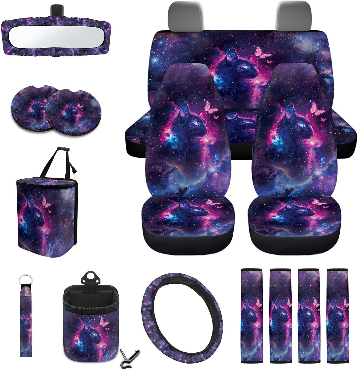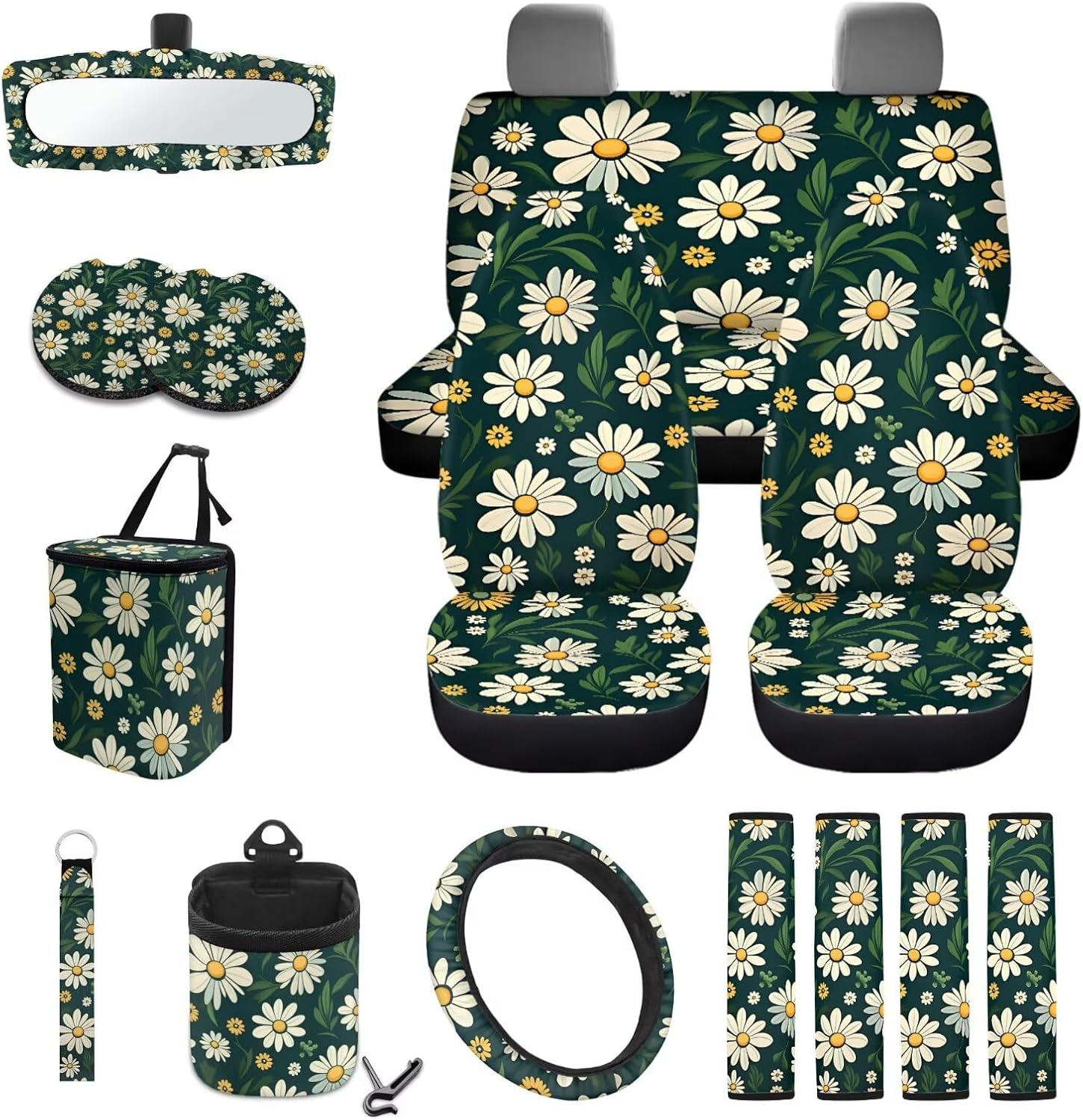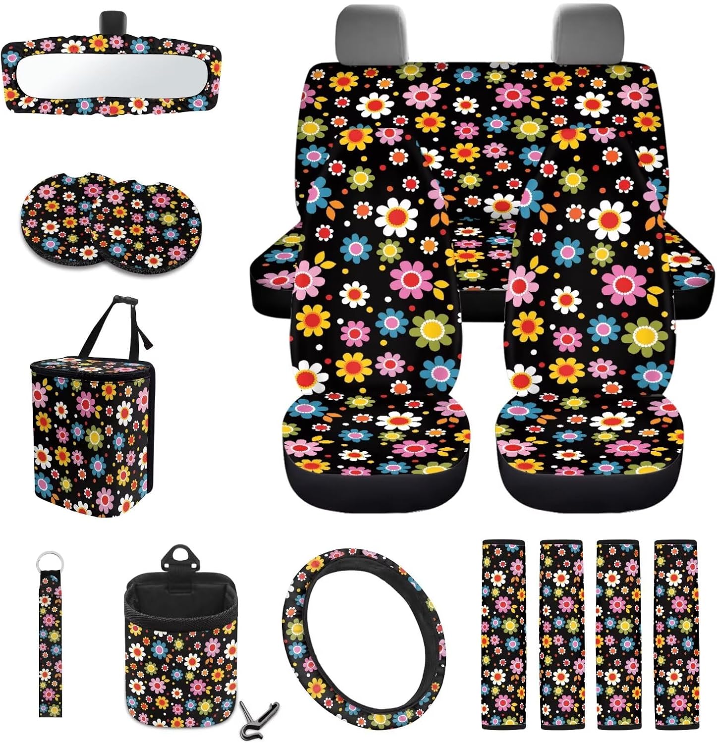 15Pcs Car Interior Cover Set 4 car front and back seat covers 4 seat belt covers 2 cup coasters 1 car air vent storage bag 1 rearview mirror cover 1 steering wheel cover 1 car trash can 1 keychain Our product is made of high-quality polyester material, which is dustproof, wear-resistant, washable, and not easy to fade or deform Our seat cover set can provide effective protection for the interior of your car, protecting it from dust, hair, and damage from sunlight; At the same time, it can effectively cover up existing flaws and bring you a new driving experience We have designed many exquisite patterns for our products, such as flowers, wolves, eagles, American flags, sea turtles, etc; You have enough choices to decorate the interior of your car Warm Tips: This size data due to different measurement methods, small amount of error is normal. The picture shows the effect is only for reference, the final effect to prevail in kind. Washing instructions: Hand wash, do not soak for a long time, do not bleach, the temperature of the washing liquid should not exceed 45ºC.