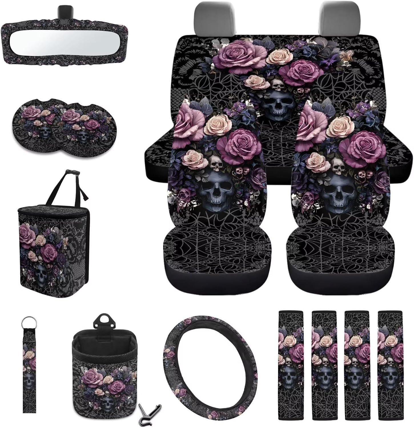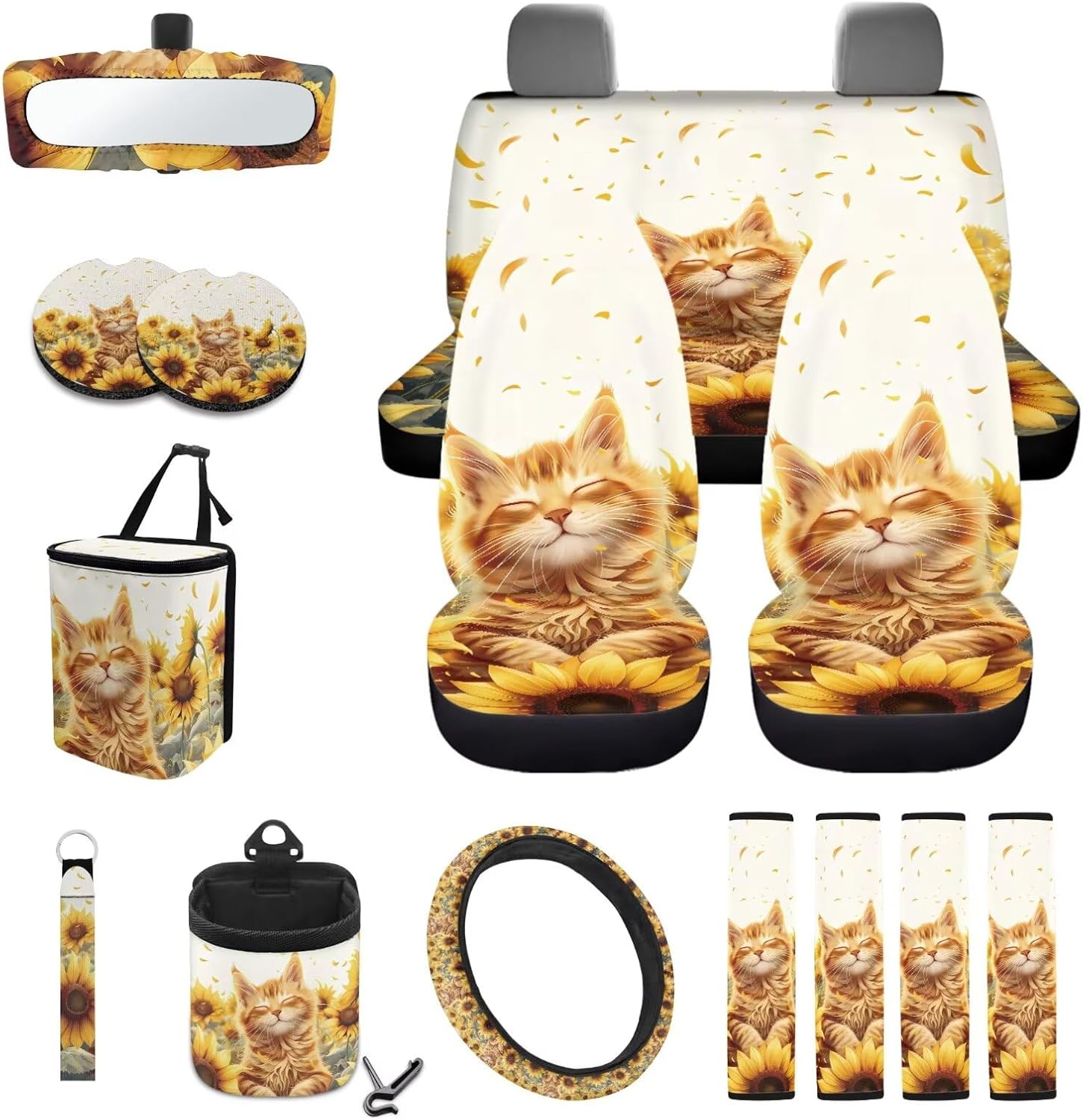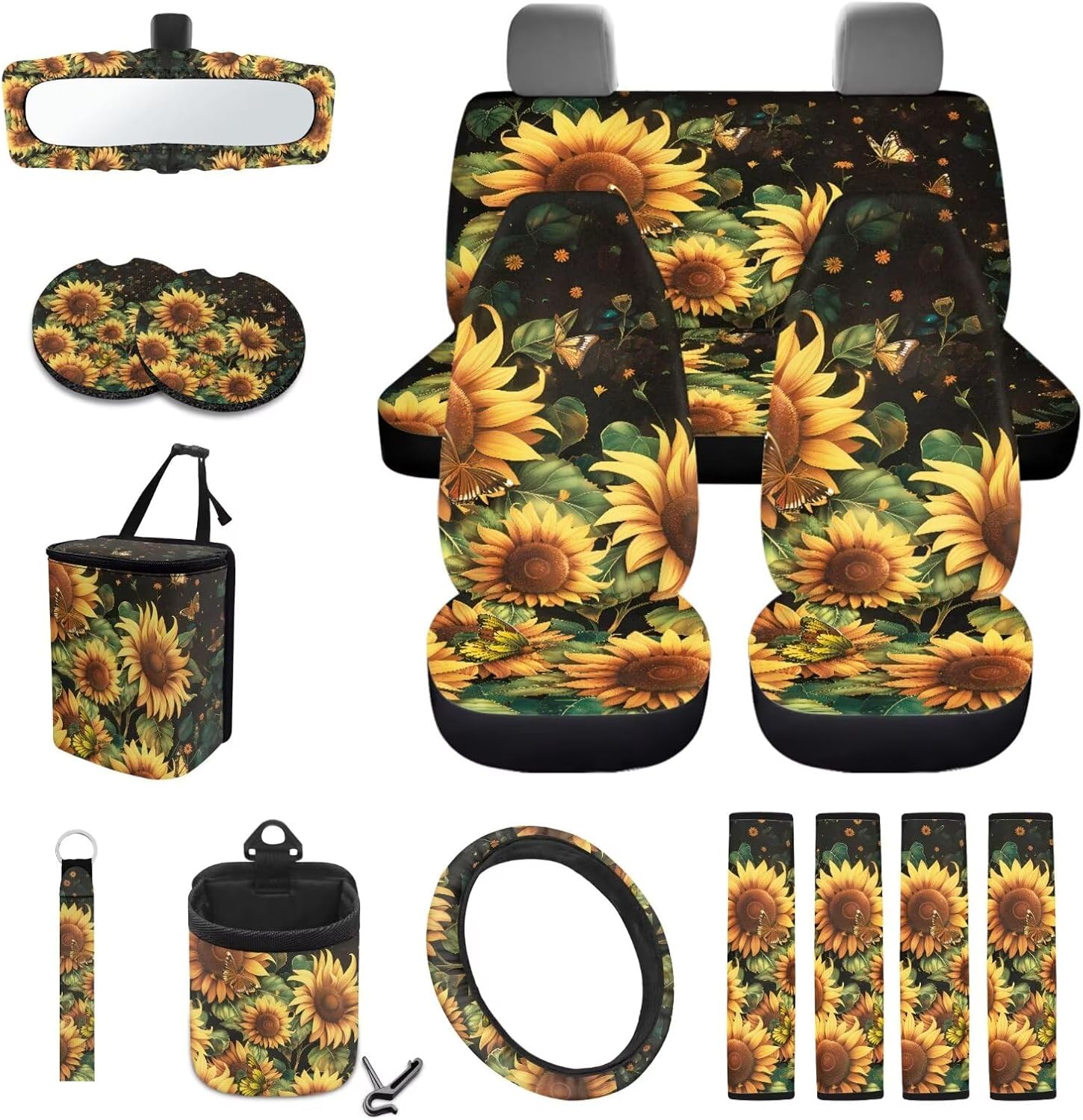 15Pcs Car Interior Cover Set 4 car front and back seat covers 4 seat belt covers 2 cup coasters 1 car air vent storage bag 1 rearview mirror cover 1 steering wheel cover 1 car trash can 1 keychain Our product is made of high-quality polyester material, which is dustproof, wear-resistant, washable, and not easy to fade or deform Our seat cover set can provide effective protection for the interior of your car, protecting it from dust, hair, and damage from sunlight; At the same time, it can effectively cover up existing flaws and bring you a new driving experience We have designed many exquisite patterns for our products, such as flowers, wolves, eagles, American flags, sea turtles, etc; You have enough choices to decorate the interior of your car Warm Tips: This size data due to different measurement methods, small amount of error is normal. The picture shows the effect is only for reference, the final effect to prevail in kind. Washing instructions: Hand wash, do not soak for a long time, do not bleach, the temperature of the washing liquid should not exceed 45ºC.