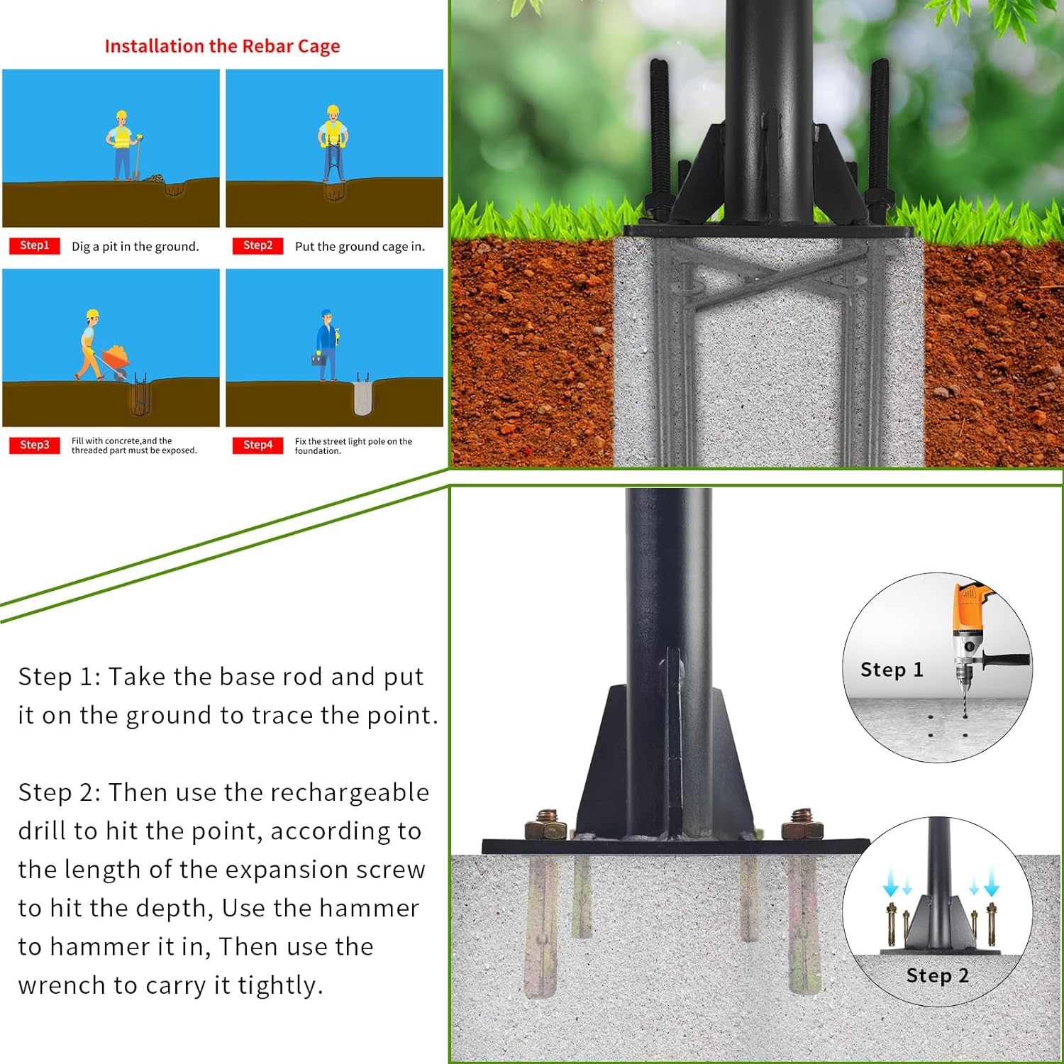 VERSATILE USAGE Shade sails poles are ideal for indoor and home outdoor areas - covering pools, lawn,garden, patio, garage and spa's.Shade sails canopy poles are also ideal for using in public outdoor areas - community centres, child care centres, construction sites, playgrounds, park activity areas and sport venuesTIPS:Please read the installation guide carefully to ensure good installation and use.đ„100% SATISFACTORY GUARANTEE We think you're going to love our sun shade sail poles as much as we do. But in case you don't, just return it within 30 days for a full refund. Click ADD TO CART to get your shade canopy poles before we run out of stockYou can use shade sail poles with this installation kit in many places, such as garden, backyard, patio, cafe, pavilion or parking lot.Specification:- Material: Thickened wall High Quality Metal- 2x 1 Pole = Dimension: 3m/9.6ft(Assembled), 3section, 3.2ft/section, pole diameter 2.36in- Color: Frosted Black/BlackWarranty: 2 years quality warrantyWeight: 46 lbEasy to Insatall:1. Connection the Shade Sail Poles base to the rebar cage concrete basing bracket, then assemble each section pole.2. Also used the expansion screw installation.â NOTE that Product package with 8 expansion screws and 1 Concrete Basing Bracket, So you have two options for installation.đ„Hardware for Shade Sail Poles Includes - This sun shade sail poles kit includes:â 6Section x 3.2ft poleâ 8pcs x expansion screwsâ 1pcs x Rebat cage concrete basing bracketâ 2pcs x Snap Hookâ 1 x installation guide