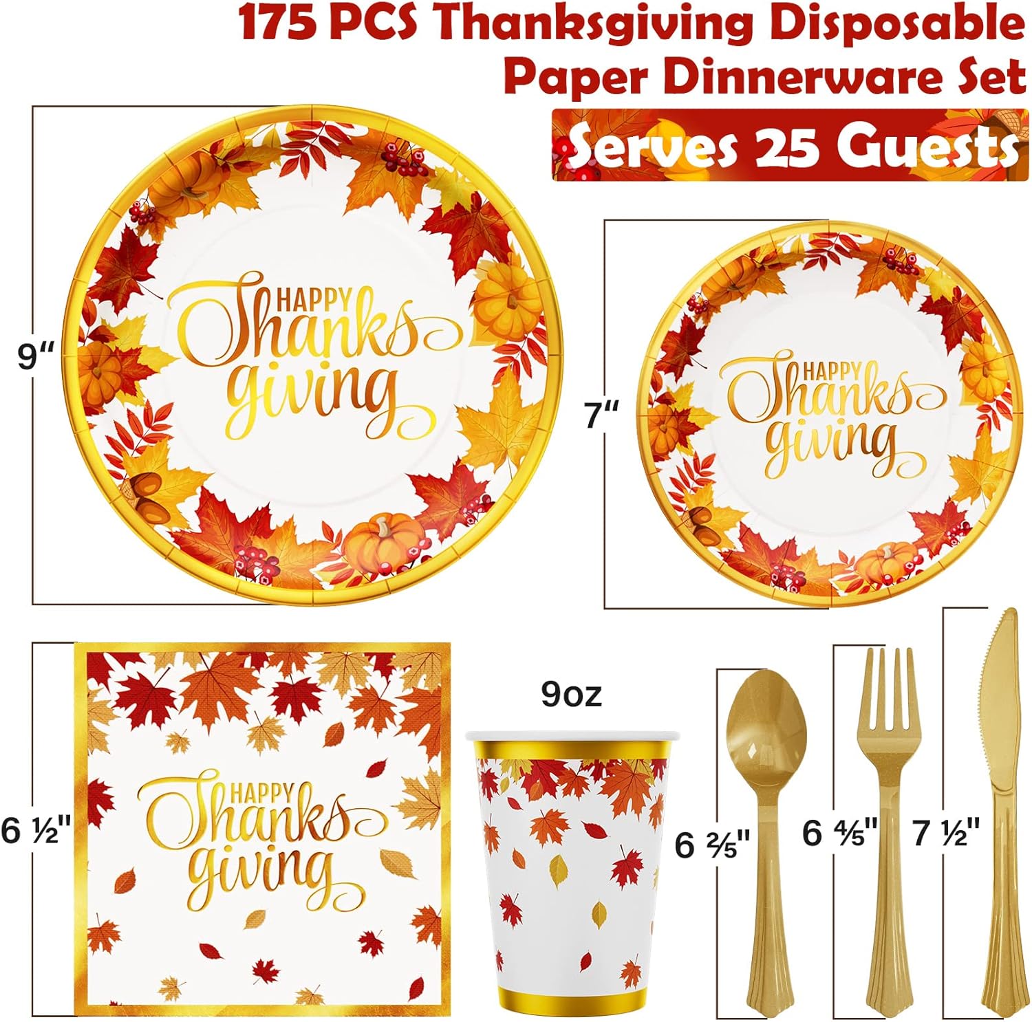 | Included Components | 25 x 9inch Paper Plates, 25 x 7inch Paper Plates, 25 x 9oz Paper Cups, 25 x 6.5inch Paper Napkins, 25 Plastic Forks, 25 Plastic Knives, 25 Plastic Spoons |