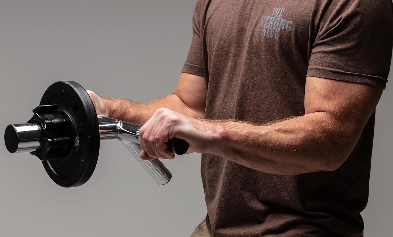 Transform your arm strength training with this professional-grade forearm and wrist trainer. This is the original USA small business made, not a chinese copycat version. This versatile piece of equipment helps develop grip strength, wrist stability, and forearm muscles through targeted resistance training. The durable chrome-plated steel construction features knurled handles for secure grip during workouts. Perfect for athletes, fitness enthusiasts, or anyone looking to get ripped forearms and enhance their grip strength at home or on the go. The compact design makes it ideal for home gyms, office breaks, or travel workouts. Use it for wrist curls, reverse wrist curls, and radial/ulnar deviation exercises to build comprehensive forearm strength. The Strong Arm accommodates different hand sizes and strength levels, making it suitable for beginners to advanced users. Regular training with this tool can help improve performance in sports, weightlifting, and daily activities requiring hand strength. It can be used with any 2" olympic disc weight.