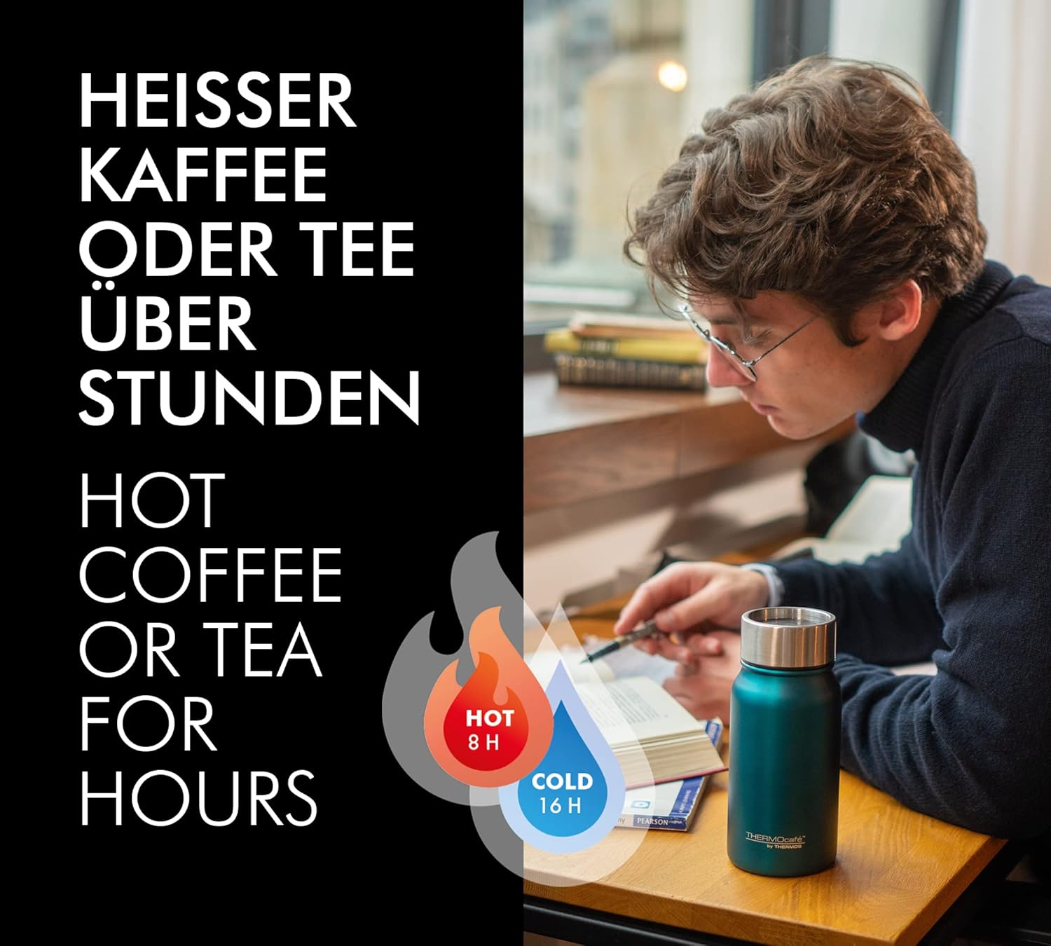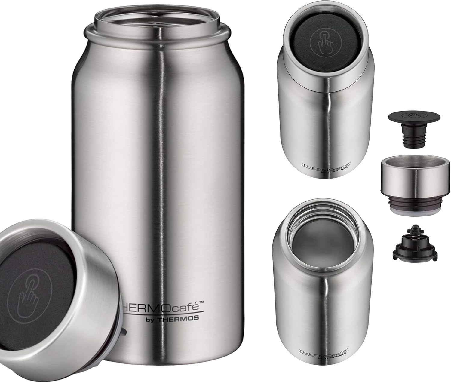 With the drinking cup, your drink stays warm for up to 8 hours or cold for 16 hours, even when you're on the go. It consists of double-walled stainless steel with no internal coating, so the taste remains unadulterated. Thanks to the push-button lid, you can drink from either side of the mug.