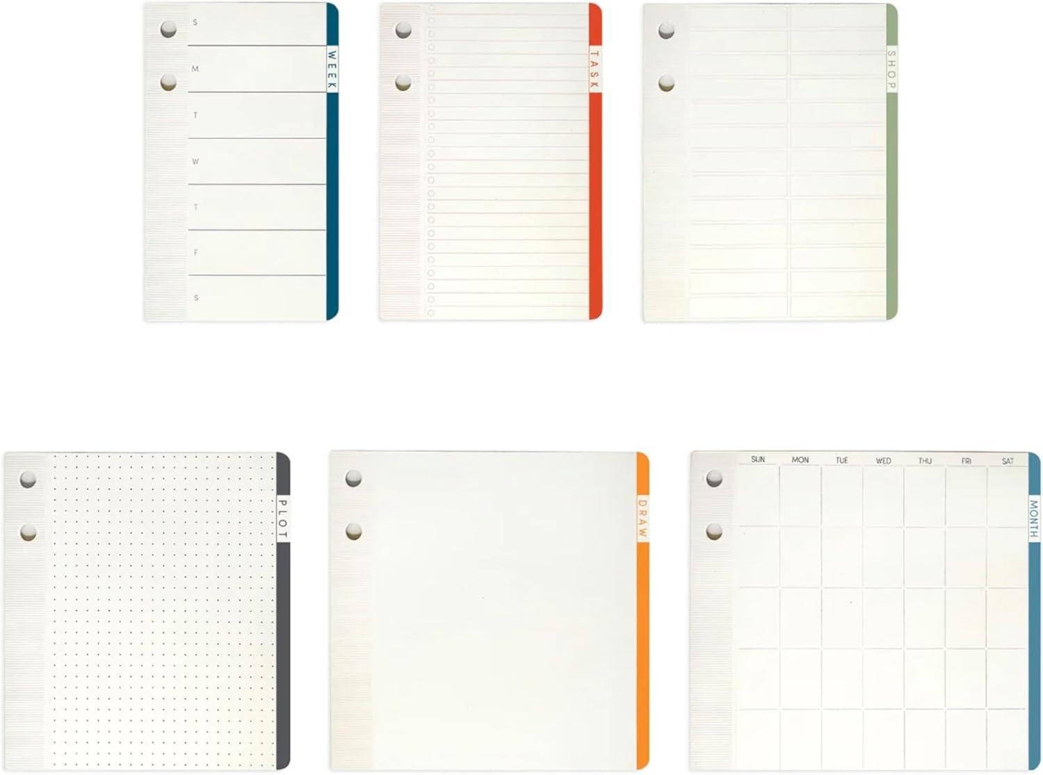 Schedule and organize your life, no batteries required! This Stacked Pads Planner Set, with its six individual perforated WEEK, SHOP, TASK, PLOT, DRAW, and MONTH pads, offers analog assistance for busy lives. Included pen and pencil hold the stack intact when at rest.