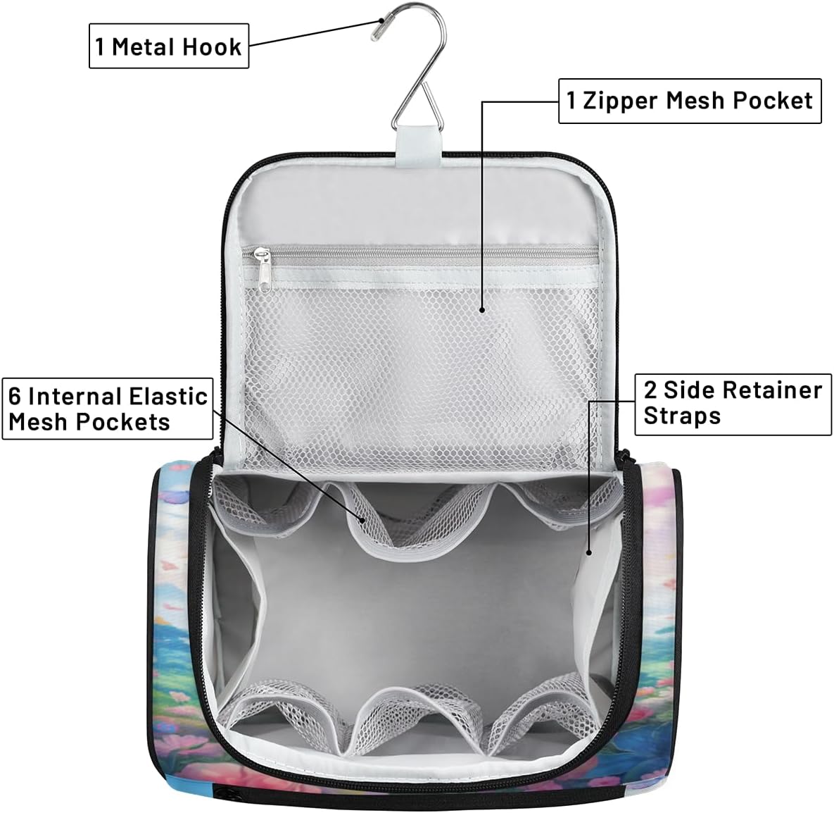 Large Portable Travel Hanging Cosmetic Bag Waterproof Toiletry Storage Pouch for Travel Essentials, AccessoriesIdeal Size - 26 x 16.5 x 23 cm/10.2 x 6.5 x 9.2 inchLarge travel toiletry bag for vacation, business, family trips, camping, beach, gym, hiking, bathroom organizer and more. Lightweight and compact enough to fit in backpacks or luggage.Fine Details- Delicate pattern print.- Dual zippers closure type.- Portable handle & hanging hook design.Practical Compartments Deisgn, Organized & Convenient1 main bag, with 6 small elastic edged mesh pockets inside, which can be used to store small items such as makeup brushes, toothbrushes, medicine boxes, toiletries;2 side retainer straps;1 zipper mesh bag and 1 metal hook at the top of the interior, sturdy hooks can be hung anywhere for easy access to everything without taking up space on the counter;1 zipper front bag for paper towels, cards and other items that need to be stored and accessed easily to save time;2 side pockets for small water bottles and folding umbrellas.The Best Choice for GiftsThe storage bag will be a perfect Thanksgiving, Christmas, holiday, birthday gift for your family, friends, student, girlfriend, when they are preparing for vacation, business trips, traveling, summer camps, camping. The bag can easily organize and store their daily necessities, accessories or jewelry.