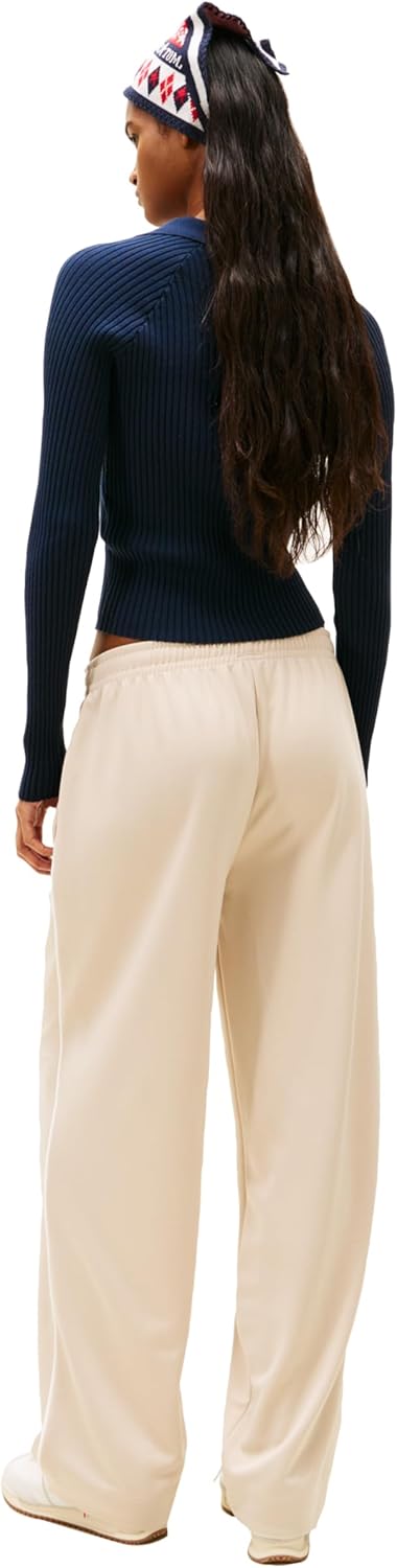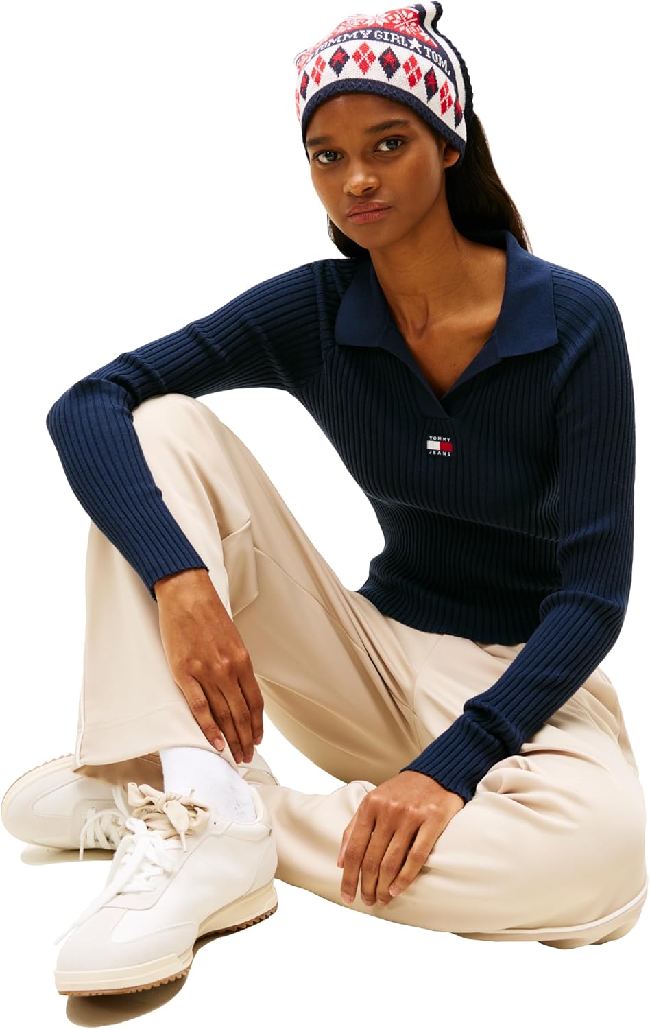 Introducing the Ribbed Sweater Polo with Embroidered Flag Logo from Tommy Jeans, featuring the iconic flag logo and collar detail, crafted from a premium blend of cotton and other fibers for unparalleled comfort. Complete with embroidered flag logo, this lounge sweater offers both style and functionality. The soft construction ensures warmth without sacrificing breathability, making it perfect for everyday wear. With its slim silhouette, this pullover sweater strikes the ideal balance between comfort and style, flattering the silhouette while providing ample room for movement. Pair it effortlessly with your favorite Tommy Hilfiger shirts, tees, shorts, pants, jeans, jackets, or coats for a versatile and timeless look suitable for any occasion, whether casual or formal. Whether you're heading out for a day of leisure or hitting the gym, this sweater is the ultimate go-to. Treat yourself or surprise a loved one with this versatile wardrobe staple, ideal for mothers, sisters, girlfriends, wives, daughters, or friends. Experience the unmatched quality and everyday style of Tommy Hilfiger with this must-have women's sweater.