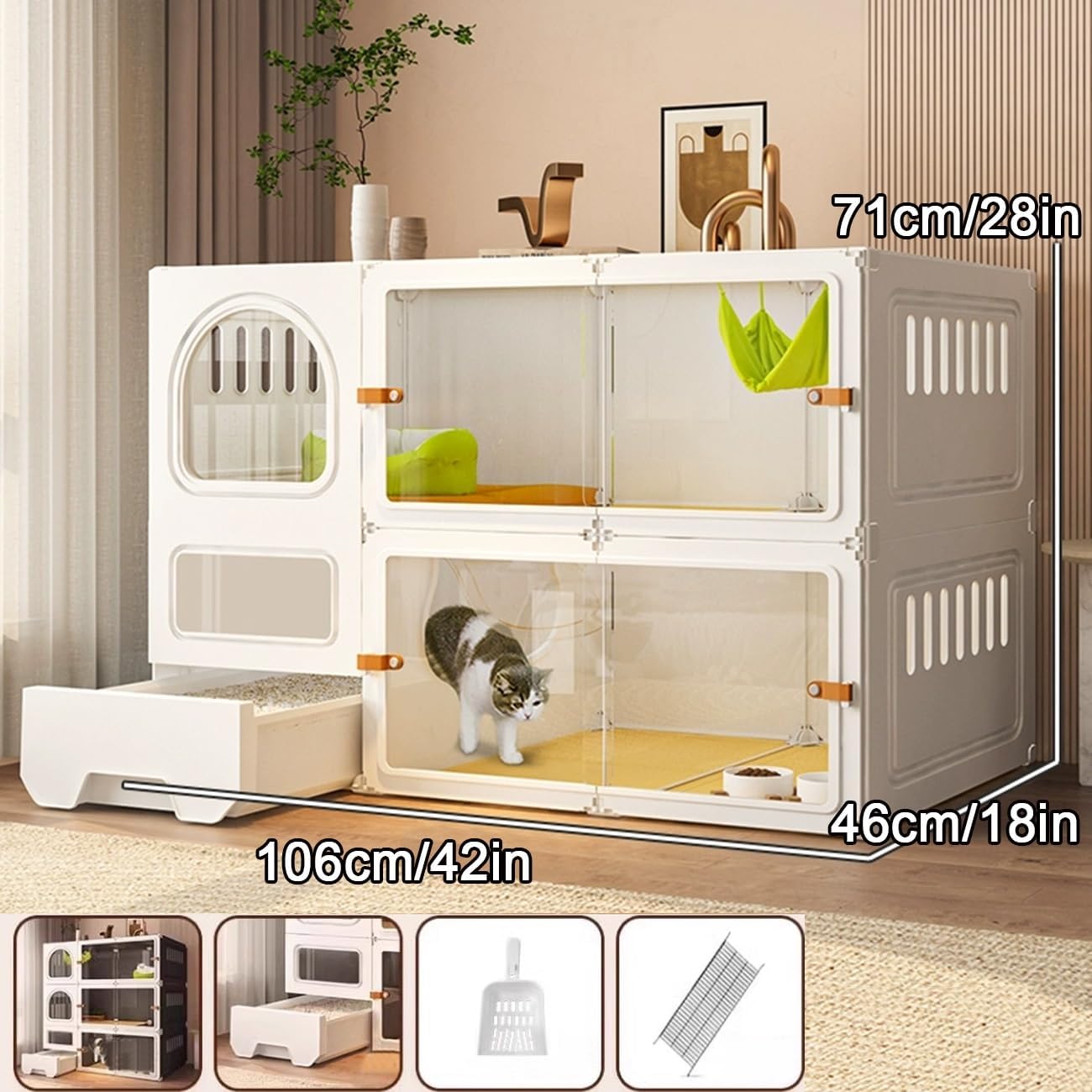 This DIY cat cage is designed to enhance your pet's environment while ensuring their comfort and safety. Featuring transparent panels, this cage allows your curious cat to explore their surroundings without feeling confined. Your feline friend can observe the world outside, promoting mental stimulation and reducing anxiety. The sleek white and gray color scheme blends seamlessly with your home decor, making it an attractive addition to any room. Constructed from durable PP, PS, and iron materials, this cat cage is built to last, providing a secure space for your pet. It includes a cat toilet and a shovel, making it easy to maintain a clean and hygienic area for your furry companion. This multifunctional design not only offers a cozy retreat but also encourages your cat to play and engage with their environment, contributing to their overall well-being. Ideal for both playtime and relaxation, this cat cage is perfect for indoor use, whether you're at home or away. It's a great solution for cat owners looking to create a safe and stimulating space for their pets. Invest in this cat cage to give your feline a delightful place to explore and rest, ensuring they lead a happy and active lifestyle. Packing list: - 1x Cat cage - 1x Cat toilet - 1x Shovel