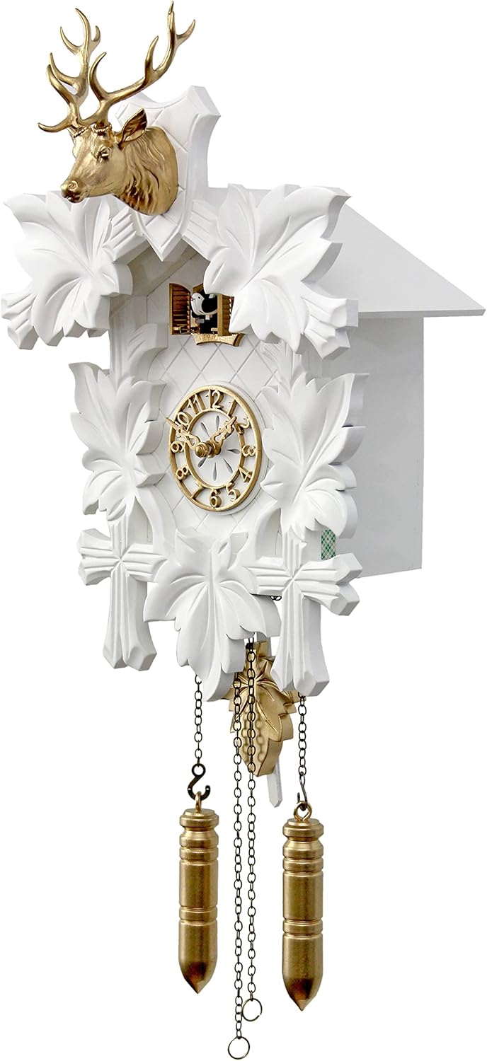 Colour: White Dial, hands and weights are made of wood. The clock plays 12 tunes. The tunes are: Happy Wanderer, Edelweiss, Dr. Zhivago, Swan Lake, He was beautiful, Lorelei, Home sweet home, Sound of silence, Clementine, The Entertainer, Love theme of the movie, For Elise. The clock needs three baby C batteries. Cuckoo calls on the hour with echo. The clock has a battery operated movement with automatic night-off. The running-time of the batteries is about one year. The size refers only to the clock, without pendulum and weights. 2 years product warranty. The clock is made of wood.