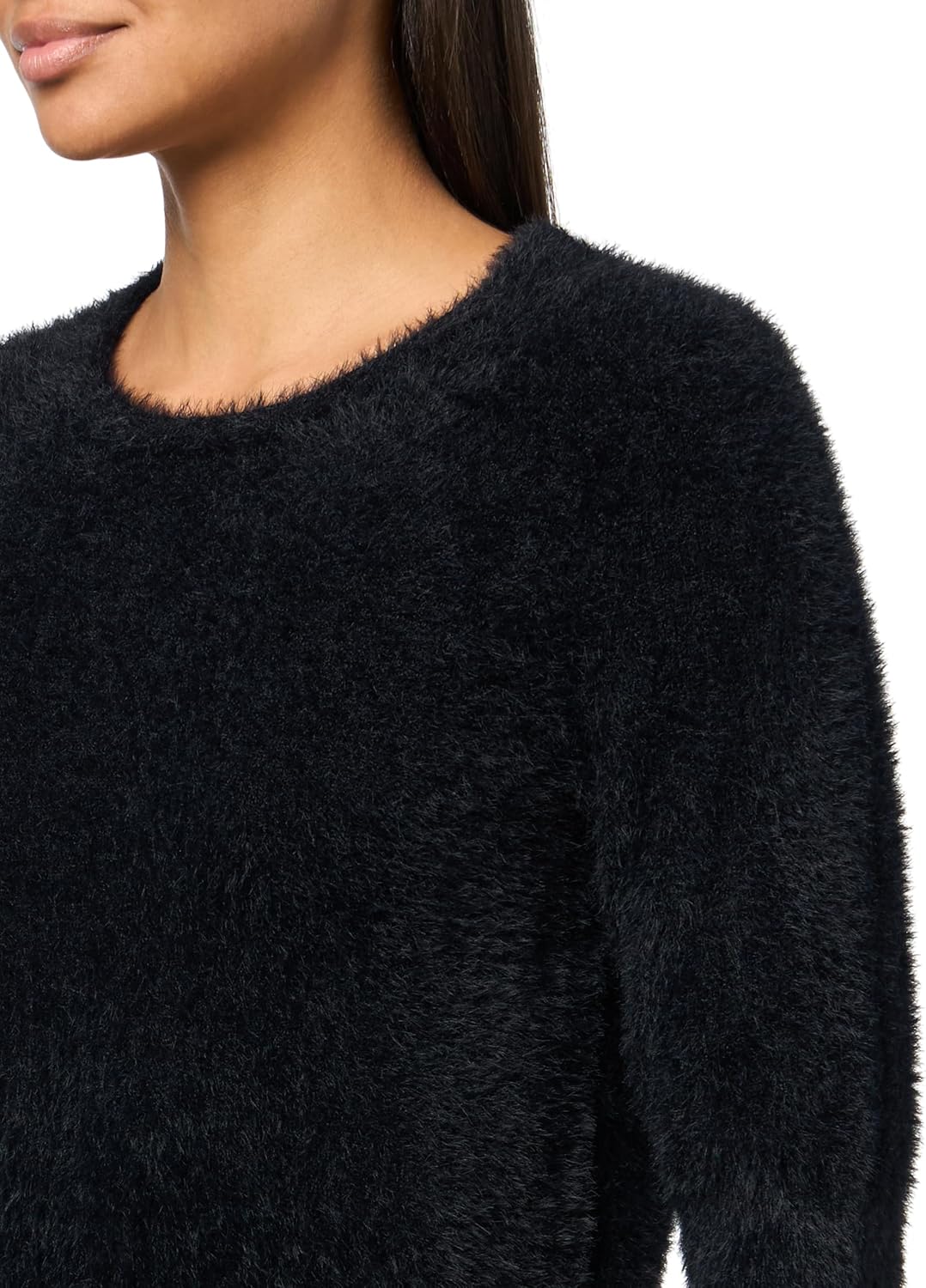 A slightly cropped fuzzy sweater with elbow length sleeves, a slim yet stretchy fit, and a soft, cozy texture