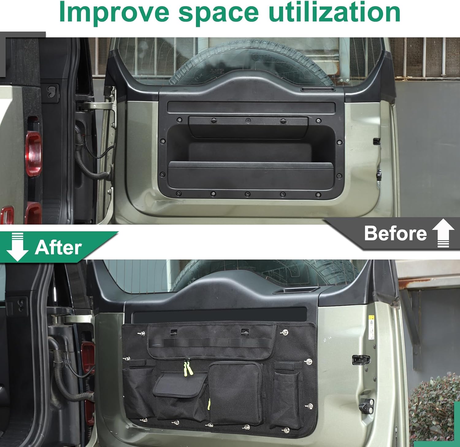 📢 Why Choose HIRUFAIT?Quality assurance: We use high-quality materials to ensure that our products are durable and long-lasting.User centered design: Every detail provides convenience for you.Customer Support: If you have any questions, our friendly team is always at your service!📢 Packing List:1 x Tailgate Storage BagUpgrade your Land Rover Defender now!Say goodbye to the scattered and rolling items in the trunk, HIRUFAIT tailgate storage bag brings a revolutionary storage solution for your car! Made of Oxford cloth, waterproof and tear resistant. Add the purchase immediately to keep the cargo space organized!📢 Technical Specifications100% Brand NewMaterial: Oxford ClothColor: BlackCompatible models: Land Rover Defender 90/110/130 2020-2025