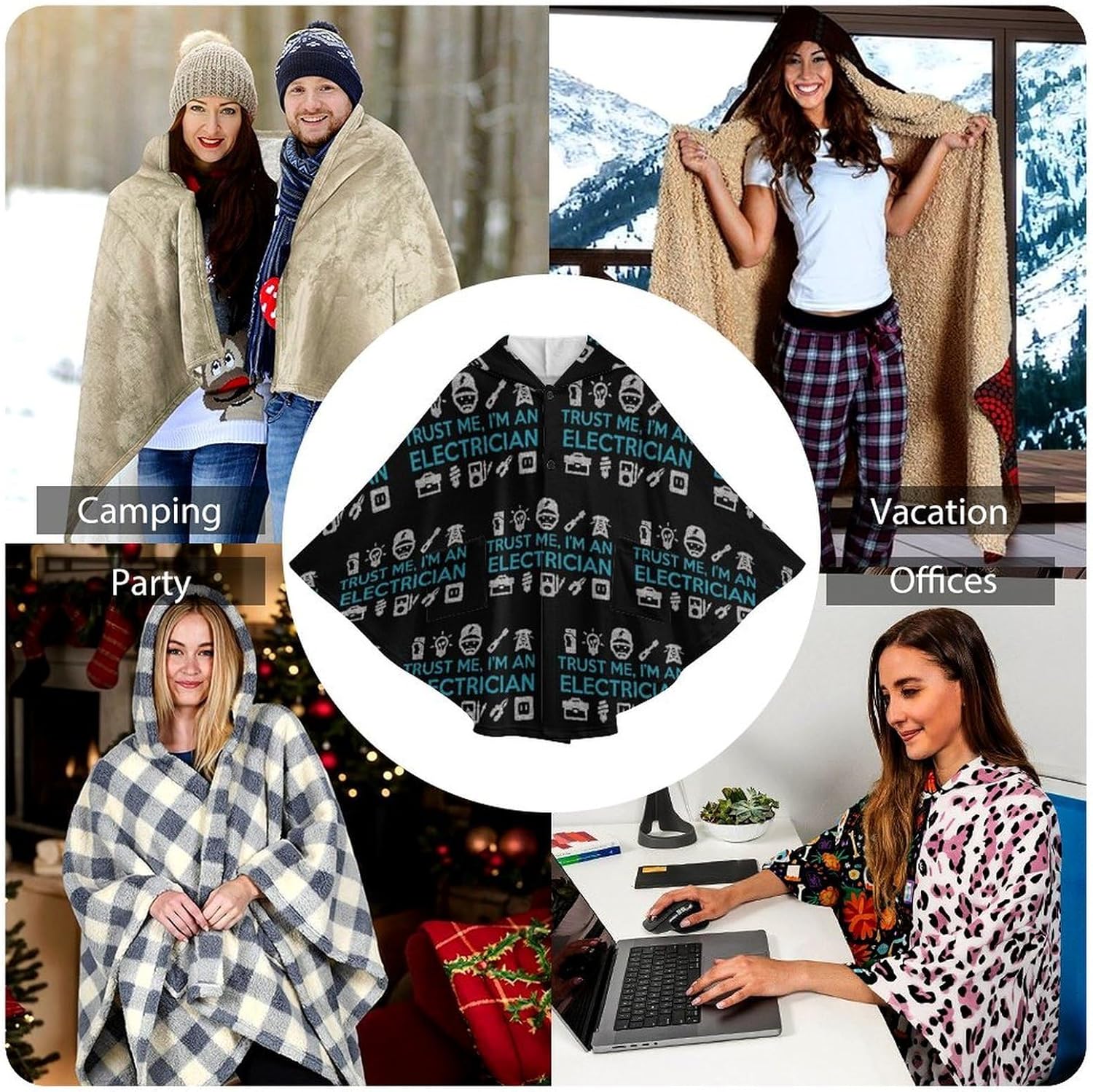 The wearable blanket is made of soft and comfortable flannel fabric, which makes you feel warm in spring, autumn and winter. It has a cape-like shape, a button closure for easy wearing and taking off, and two pockets.