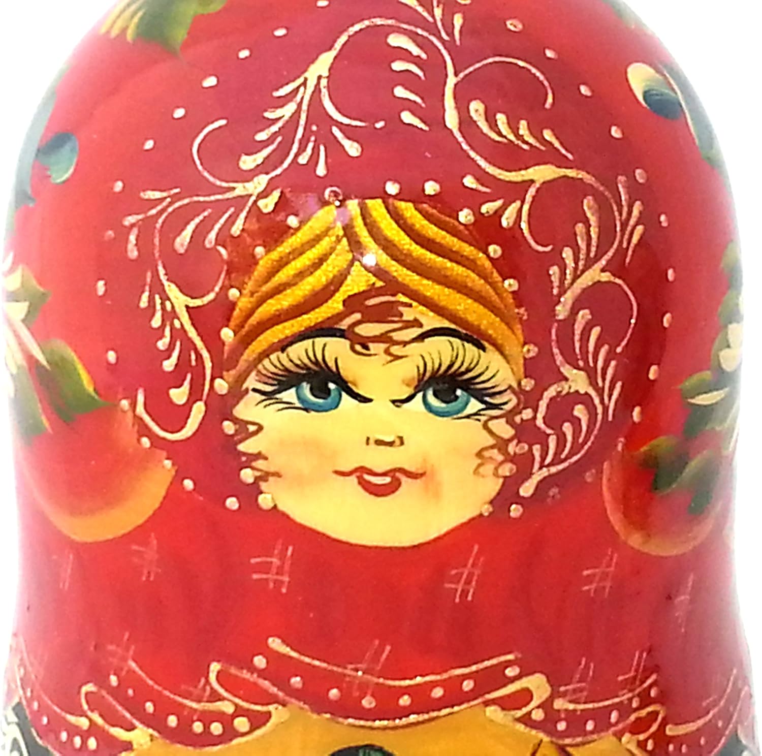 This hand painted matryoshka set tells the story of the classic Tale of the Tsar Saltan by Pushkin. The story is illustrated on this lovely five piece hand painted set. Each doll in the set shows a different scene from this famous fairytale. This hand painted 7 piece set has a glossy lacquered finish and is signed by the artist. You can download this and many more Russian fairy tales from BuyRussianGifts . com