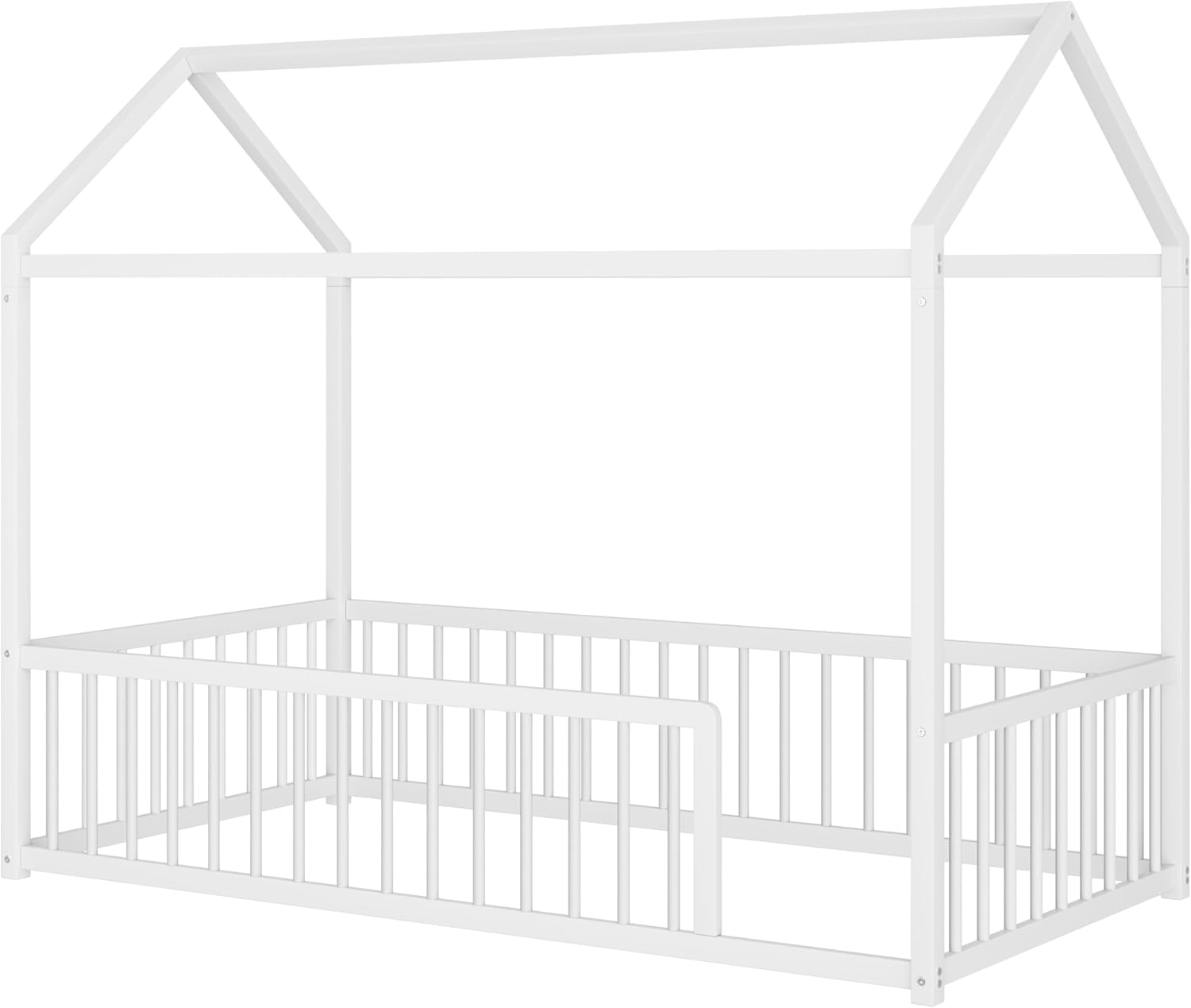 This durable metal house-shaped floor bed combines playful design with Montessori safety. It features a secure low profile, full-length guardrails with a rounded entry for independence, and a customizable roof for lights or curtains. Built with thick F-shaped columns for stability, its practical slat-free design requires no box spring, offering a long-lasting and imaginative space for kids. Product Dimensions Assembled Length (in.):77.50 Assembled Width (in.):41.30 Assembled Height (in.):62.80 Product Weight (lbs.):63.93 Twin Bed Material :Metal Package Number :1 Color: White/Black Assembly Required: Yes Slats/Mattress Included: No