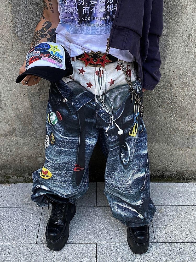 Elevate your street style to extraordinary heights with these remarkable unisex jeans that masterfully blend Y2K nostalgia with timeless vintage allure. Adorned with a strikingly designed 3D double waistband and exceptionally unique graphic prints, they showcase a bold and artful fusion of grunge, hip - hop, punk, and streetwear aesthetics. The baggy wide - leg silhouette not only ensures unparalleled comfort but also makes a fearless and utterly captivating fashion statement, perfect for trendsetters who dare to stand out from the crowd. Whether you're cruising through the city streets, hitting up a music festival, or attending a laid - back gathering, these jeans will effortlessly become your ultimate go - to choice, infusing every look with an edgy, retro - cool vibe that's bound to turn heads and spark immediate desire.