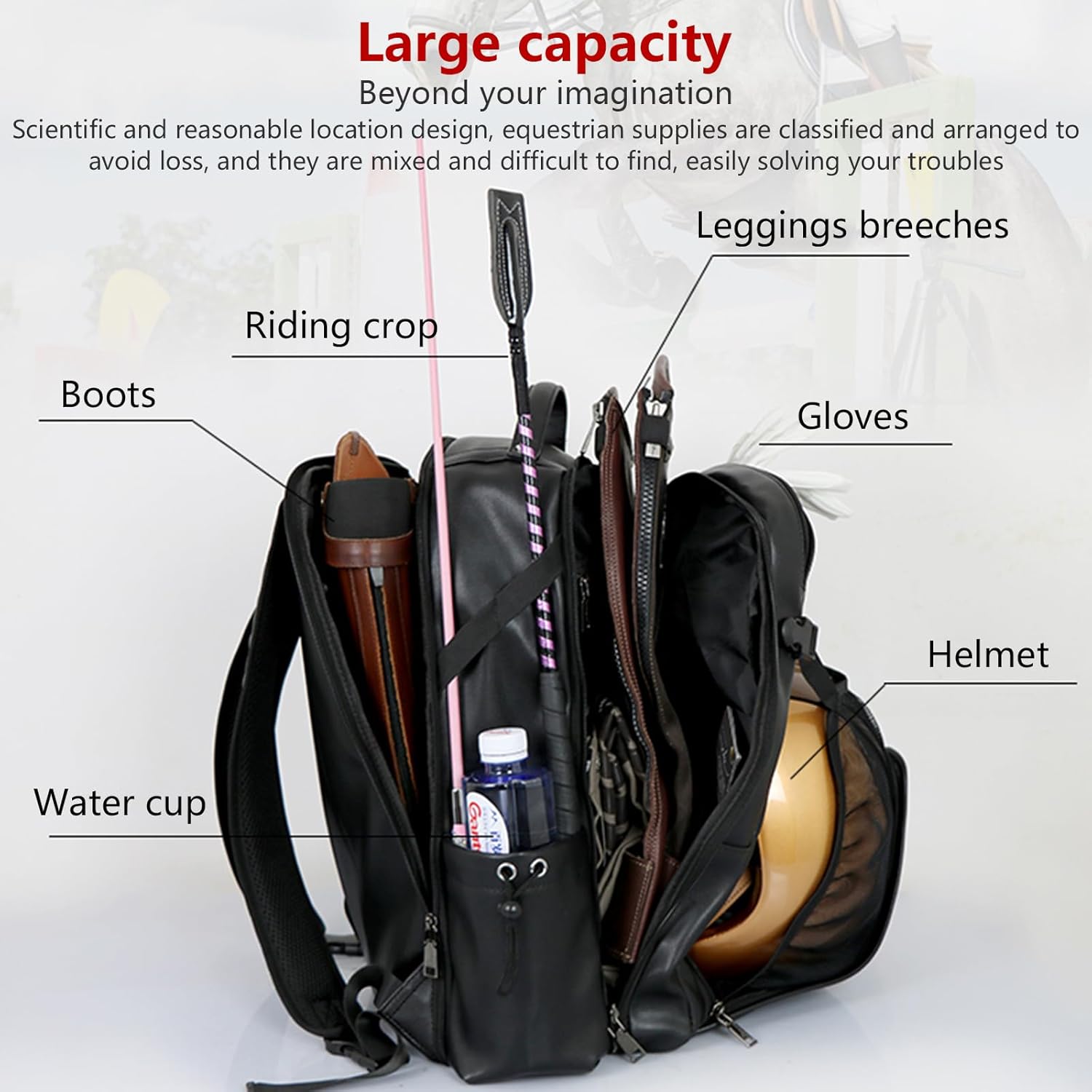 UNISTRENGH Equestrian Professional Waterproof Bag Horse Riding Backpack BlackDimensions:BlueFull size: 13.8''L x 7.9''W x 18.5''D (35x20x47cm)BlackSize: 12.2''L*6.7''W*17.7''D / 31x17x45cmWeight: Approx. 1.54 lbs / 700gNote: Tolerance: manual measurement, within 0.39"-0.79" deviation.Feature:1. Whip holder2. There is a zipper pocket on the left side of backpack, easy to hold some important goods. And also a "D" type ring buckle on there,you can hang some decorations.3. Riding boots bag deluxe with separate concealed helmet compartment.4. Mega functional with many compartments.5. Waterproof - pu leather with waterproof coating treatment, prevent water infiltratio.6. Durable - Walk the line fine,inclusion suture part of high strength.Package Included:1 x Equestrian Horse Riding BackapckBest Warranty:24h x 7 Email Support30 Days Refund GuaranteeWorry-free 12 Month Warranty.