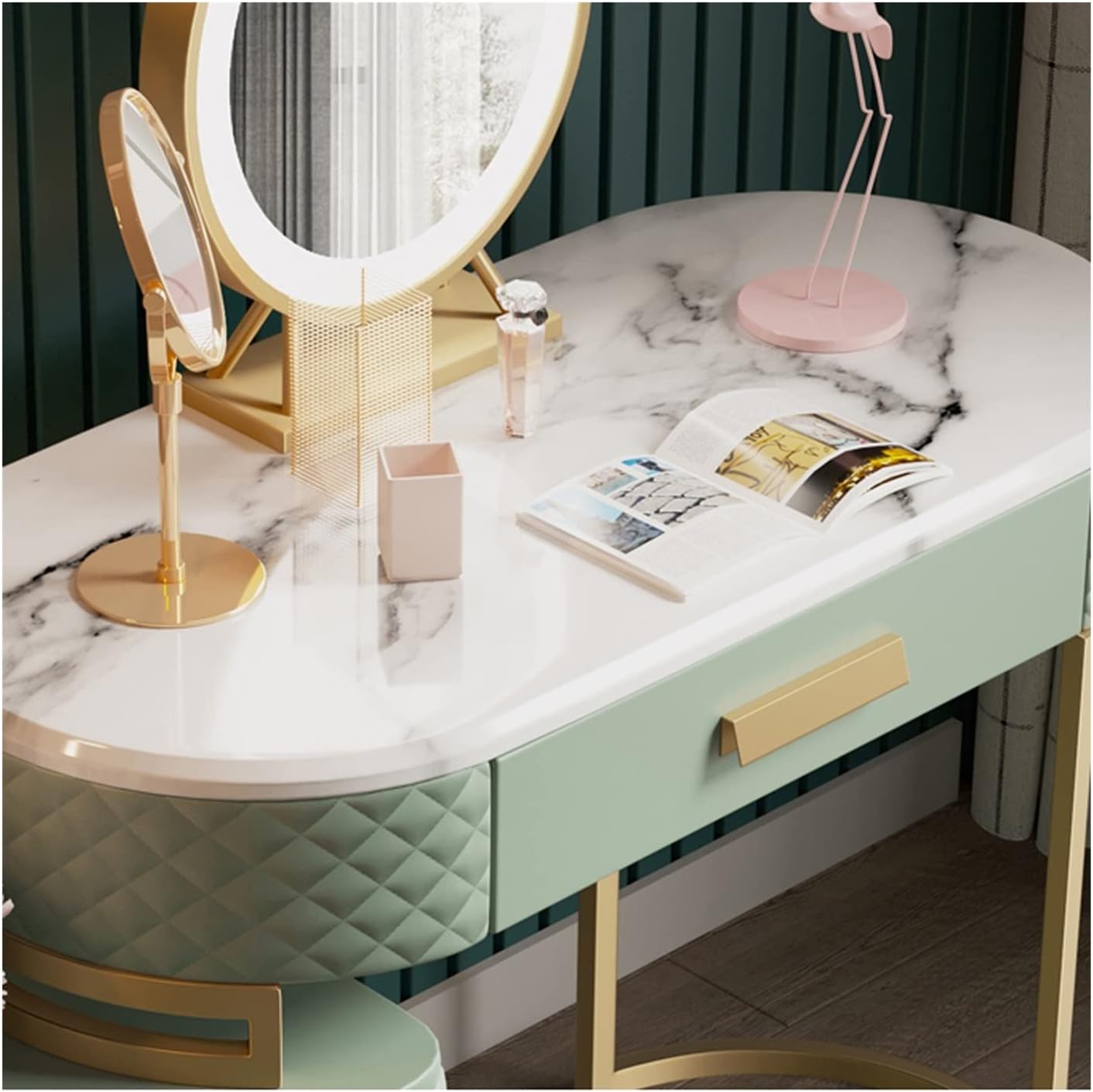 As a simple and elegant piece of furniture, it is perfect for your bedroom. Clean lines, suitable for most homes. It is the perfect choice for the goddess.Marble Dresser Storage Cabinet Bedroom Small Apartment Simple Makeup Table Green Mirror Side Cabinet With Drawer Frame Dressing TableProduct name: DresserProduct material: artificial boardFurniture structure: frame structureColor: greenInstallation: AssembleApplicable: bedroom, cloakroom, office, hotelPackage: 1 Dresser, 1 Makeup Mirror, 1 Makeup Stoolnotes1 Please check the size and color before purchasing.2 Except for items not shown in product photos.3 Please note that due to different monitors, there may be slight color differences, please understand.4. The above data is for reference only, the size is measured manually, each variable may be different, please refer to the actual product, thank you.This makeup dressing set is very convenient to assemble in short time by yourself even you are a female according to instruction. With smooth, flat and glossy surface, the dresser set can be cleaned up with damp or dry cloth.