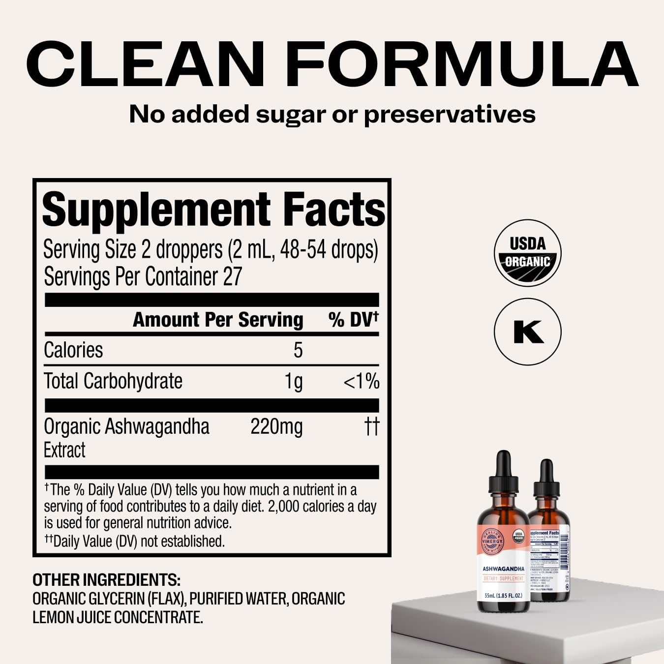 220 MG OF ASHWAGANDHA EXTRACTCLEAN INGREDIENTS: Our liquid ashwagandha drops are USDA Organic, Non-GMO, Gluten-Free, Kosher, Vegan & Paleo Friendly. There is also No fillers, additives, artificial flavors, or natural flavors.FREE FROM ALCOHOL: Potent water extracted alcohol-free formula.IMPROVE YOUR SLEEP: Ashwagandha extract may help with occasional sleeplessness.*REDUCE YOUR STRESS: Ashwagandha is a special herb that acts as an adaptogen in your body, helping you have a healthy response to stress.*ABOUT ASHWAGANDHA: Ashwagandha is a special herb that acts as an adaptogen in your body, helping you have a healthy response to stress.* With all the stresses and challenges life throws at us, some help to cope with it can really go a long way! And that’s not all that ashwagandha has to offer. Ashwagandha supports healthy cognition and even helps with occasional sleeplessness to help you feel your best!*HOW TO USE: Serving: As a dietary supplement, take 2 dropperfuls (2mL), 1 to 2 times a day. One serving is approximately 48-54 drops.Storage: Store in a cool, dark place.