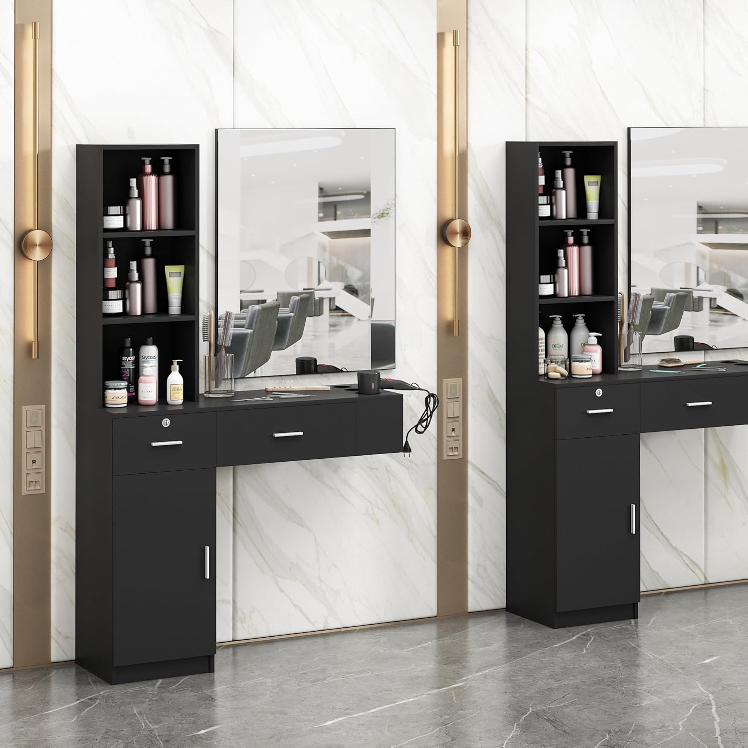 Description: Are you planing to open a salon and are wandering what equipment you’ll need? Then you’ve landed in the right place. Beauty Salon Station - the first choice for you to start a salon. You’ll get a modern and stylish beauty salon station with spacious storage. Classic black surface added with concise structure of our salon station is simple and elegant can upgrade any style salon studio, barber, tattoo shop, or even your dressing room etc. The station has 3-storage shelf, 2 drawers and one large bottom cabinet, proving a large storing space for hair-care productions salon. A lockable drawer is designed to provide a secure storage for your valuables. Additionally, the spacious desktop with sleeves is easy handling of heated items, such as store irons, blow-dryers, and other heated tools. Three-size design helps to classify haircut tools away and keep your desktop neat and clean. Specification: Color: Black Material: Particle Board + Matt Veneering + PVC edge band Overall Dimensions:40.6"L X 13.4"W X 40.6"H Cabinet Dimension(Inner): 12.6”L X 12.6”W X 22.2”H