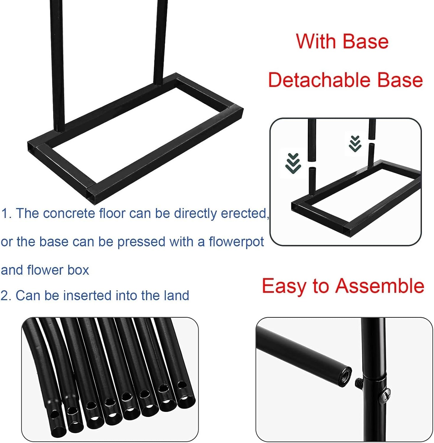 Specification:Color: black, white, dark green Material: metal iron tube Deep: 40 cm Pipe diameter: 19 mm Size: (wide x high) 80X200 cm (31.5x78.7 inches), 120 X220 cm (47.2x86.6 inches), 140 X230 cm (55X90.5 inches), 180 X220 cm (70.9x86.6 inches), 200x230 cm (78.7X90.5 inches) ), 240x220 cm (94.5x86.6 inches), 280x220 cm (110x86.6 inches), 300x220 cm (118x86.6 inches), 350x220 cm (137.8x86.6 inches) Packaging list: 1 X Gardenarch , complete accessories Whether it's an archs filled with colorful balloons at a birthday party, a bouquet of flowers at a weddings, or a garland and light decorations at Christmas...decorative arches will bring back wonderful memories1. Can be easily assembled into a wide archs or a high archs according to your needs. 2. Strong metal tube, light weight and easy to assemble. 3. With a removable base, it can be used on cement floors or flower baskets for better stability. Can also be used on soil, please ensure the depth is approximately 30-40 cm/11.81-15.75 inches.4. Can be used for climbing plants, suitable for fruits, roses and other plants. Also great for balloons, leaves, lights and other items. 5. Veneer arches are perfect for weddings, anniversaries, birthday parties, Christmas parties and to accentuate your garden or walkway.