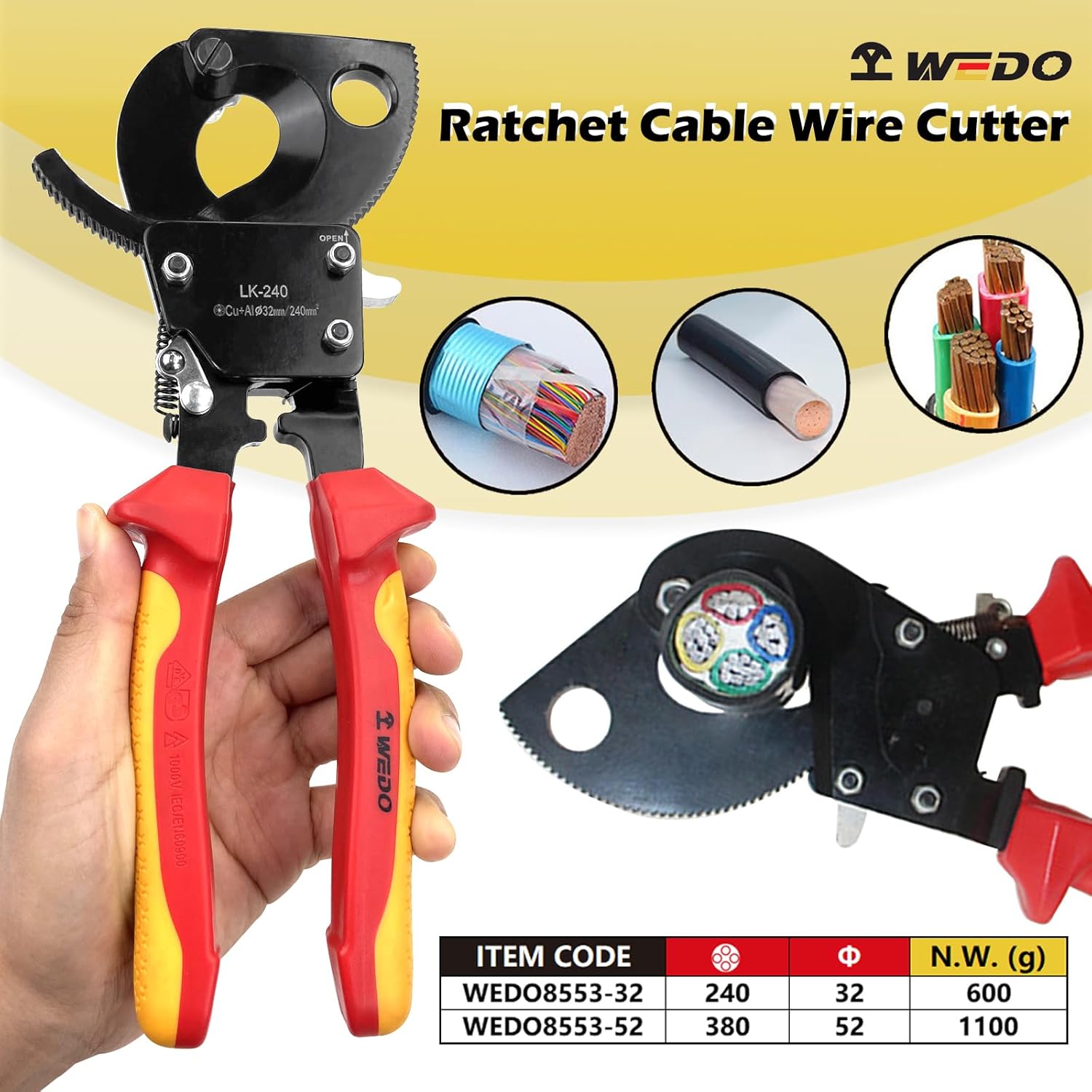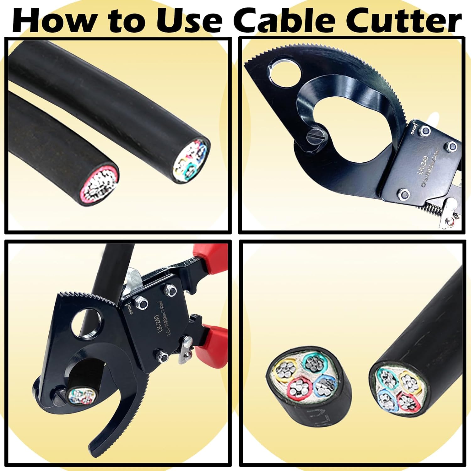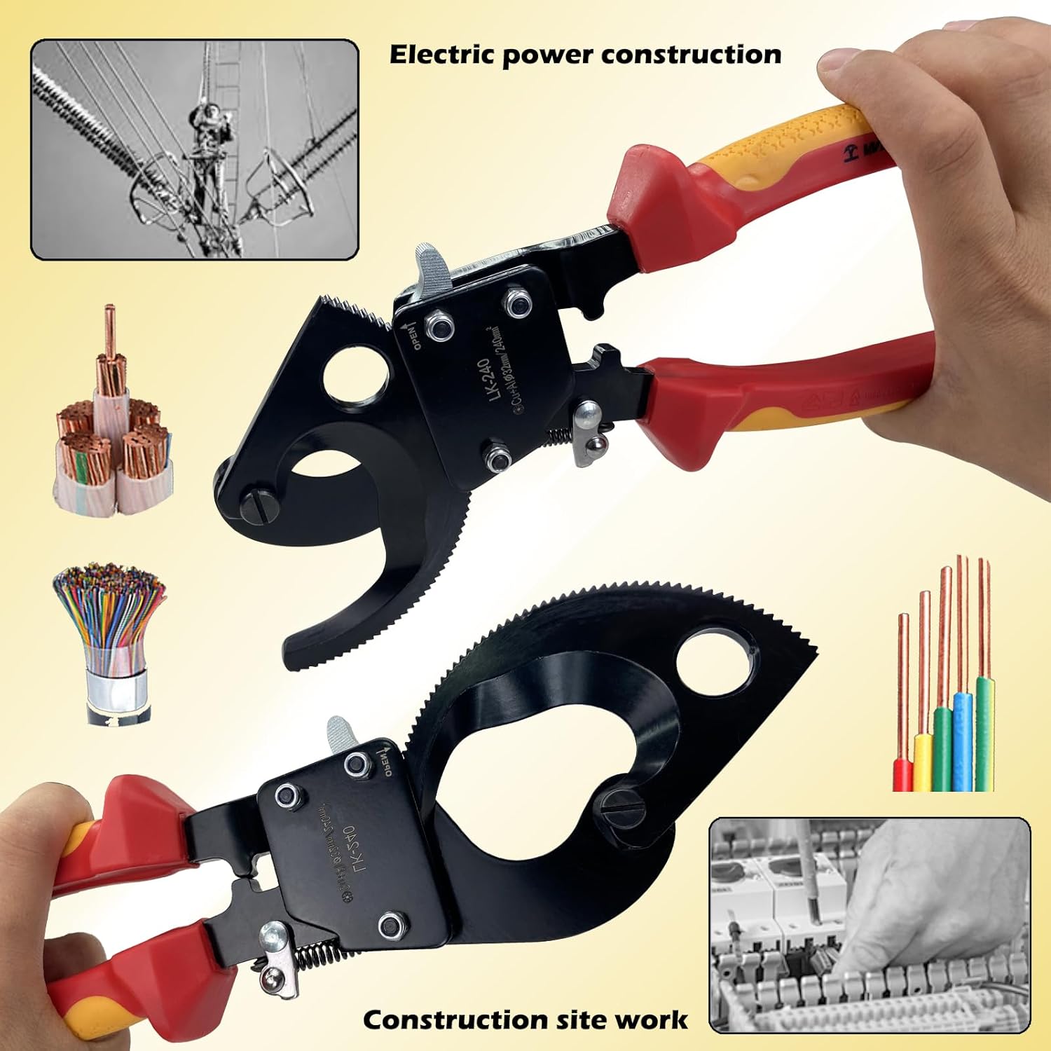【Product Advantage】: This cable cutter is not suitable for cutting steel or steel wire, and should not be used to cut live wires.The Insulated Ratchet Cable Wire Cutters features cable-gripping shear-type jaws. Laser heat-treated cutting edges last longer. It is easy to cut, high efficiency, corrosion-resistant, strong structure, reliable performance. The sharp jaw of the cable cutters is heat-treated for maximum strength and durability for lifetime use.【Ratchet Design & Labor-saving】This Insulated Ratchet Cable Wire Cutters adopts a ratchet drive device, which is easy to operate. Fast ratchet mechanism for easy, clean cut and labor-saving. Our Insulated Ratchet Cable Wire Cutters ergonomic handle design helps eliminate fatigue from extended use. Give your hands the break they deserve.【Wide Application】:The Insulated Ratchet Cable Wire Cutters wire cutters are widely used for cutting soft wire like copper/aluminum cable, single or multi stranded cable, communication cable, etc.【Unique design】: The Insulated Ratchet Cable Wire Cutters’ precision sharpened cutting blades with perform a clean sharp cut with minimal distortion to the cable. The ratchet action holds cable tight and allows rapid-straight cuts with minimum effort. Quick-release lever opens blade at anytime during operation. The compact construct allows you to cut cables in tight areas where other cutters fail.【Service】:The Insulated Ratchet Cable Wire Cutters has been exported to more than 100 countries and regions. To enhance customers’ satisfaction, we set up service centers in Germany, Russia, South Korea, Singapore, Canada, the United States, the united Arab emirates, in order to provide timely after-sales service.