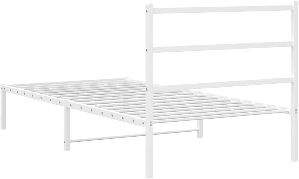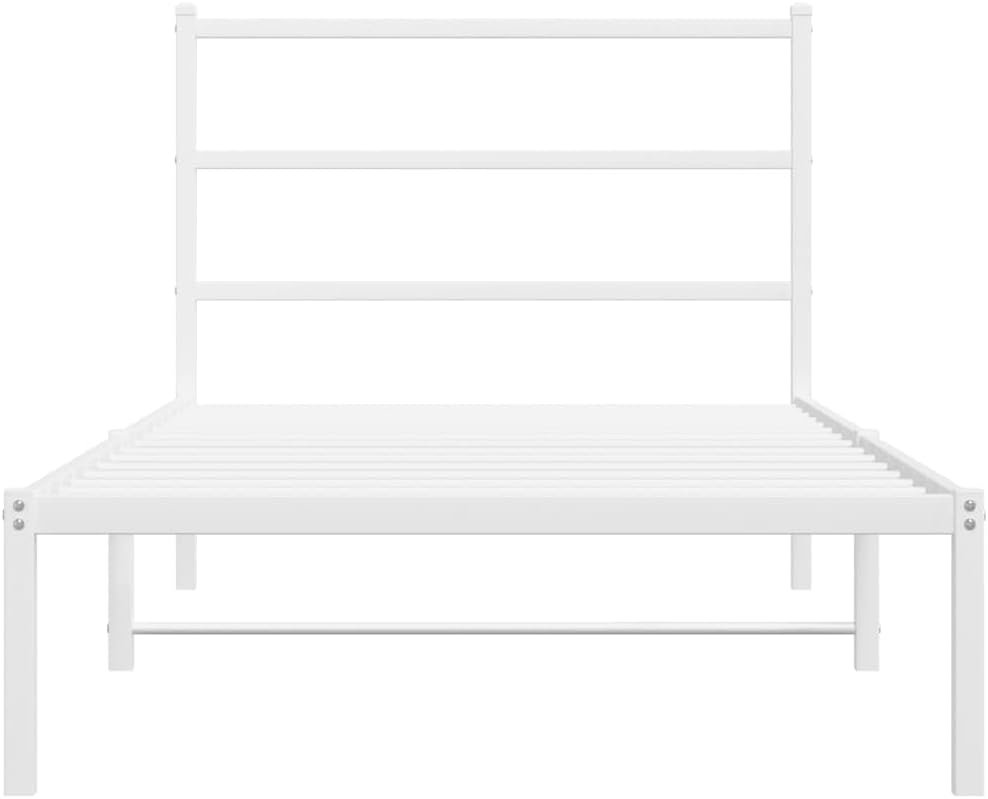 This White Metal Bed Frame with Headboard is an elegant and handy piece for any bedroom or guest room. Its modern look with clean lines brightens up your space, creating a calm vibe for relaxation, whether you're sleeping, reading, or just chilling.Made from powder-coated steel for durability, this bed frame holds up to 440.9 lbs, making it great for various sleeping needs.The headboard looks good and supports your back for comfy reading or lounging.Measuring 39.4 inches wide, 78.7 inches long, and 35.4 inches high, it's sleek yet fits well in smaller spaces.Easy to put together, it comes with clear instructions for a quick set-up using just a screwdriver and two hands.A versatile addition, it works well in guest rooms, rentals, or as a stylish option in your primary bedroom.Color: White Shape: RectangularMaterial: Metal SteelFinish: Powder-Coated Indoor/Outdoor: Indoor OnlyCover Included: NoRoom: BedroomMaximum Number of People: 1Maximum Weit: 440.9 lbsDimensions: 39.4 x 78.7 x 35.4 in (W x L x H)Leg Height: 12.2 inWeight: 31.09 lbsSwings: NoDelivery Contains: Bed frameAssembly Required: YesRecommended Number of People for Assembly: 2