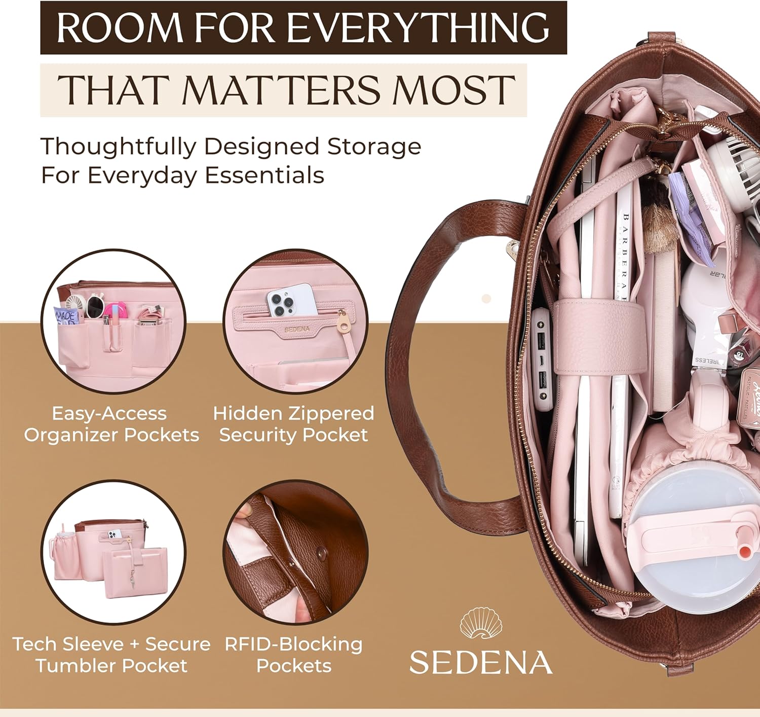The Sedena Anti-Pickpocket Laptop Tote Bag in Dark Brown is designed for women who need a stylish, functional, and secure everyday carry solution. This premium vegan leather work and travel tote includes a detachable padded sleeve that fits up to a 16-inch laptop, plus multiple interior pockets for chargers, cosmetics, notebooks, and other daily essentials. A built-in cupholder fits a 30oz Stanley or water bottle without tipping, while RFID-blocking pockets help protect your cards and passport. The anti-pickpocket zipper system keeps your valuables secure while commuting, shopping, or traveling. Perfect for business, school, travel, and everyday use, the bag also includes a trolley sleeve that slides over your suitcase handle for hands-free movement at airports. The structured, water-resistant vegan leather design offers durability, modern style, and exceptional comfort. Ideal for professionals, students, travelers, commuters, and women seeking a multifunctional laptop tote that blends fashion and utility.