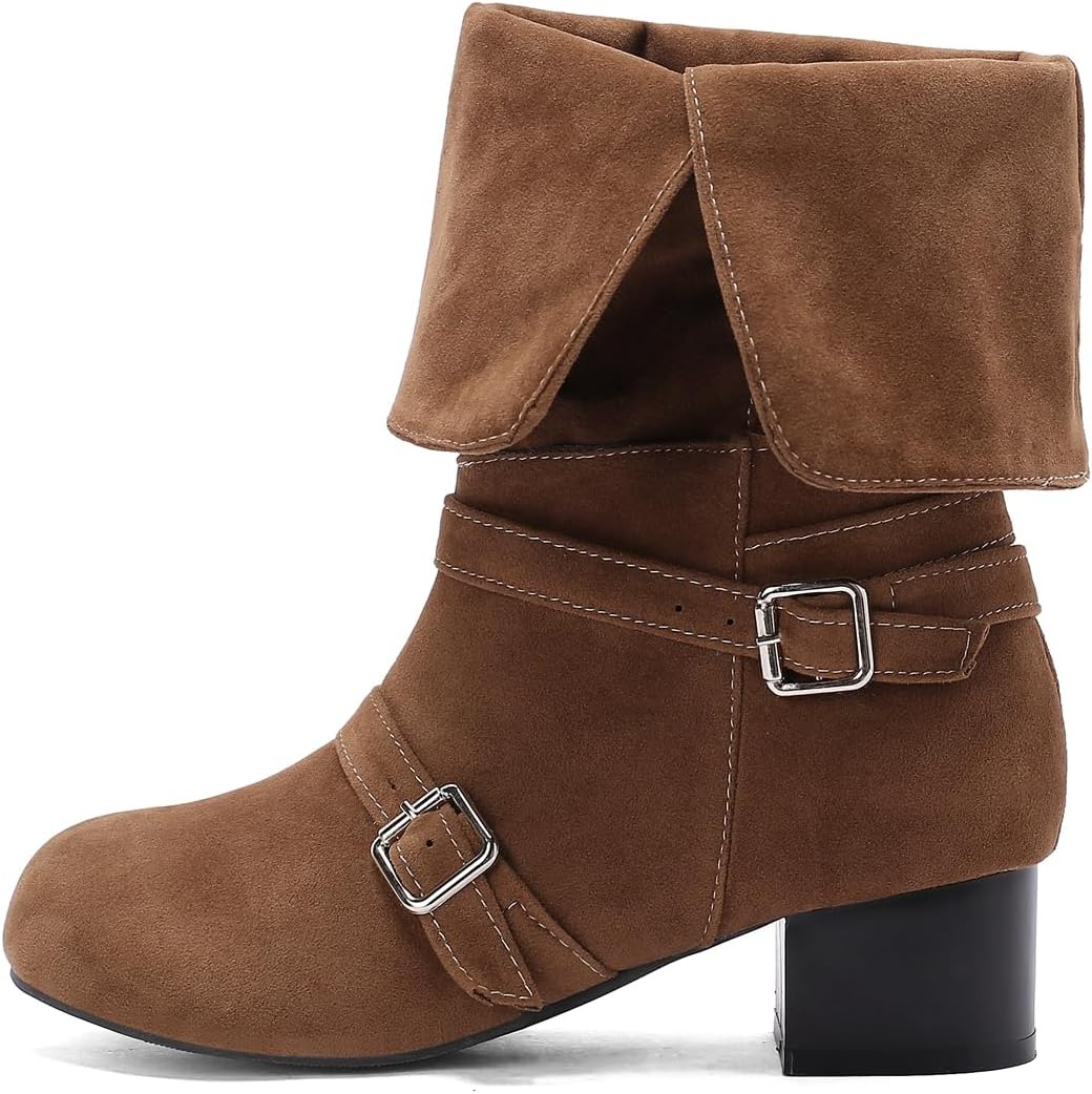 Women's Fashion Round Toe Dressy Ankle Boots Pull On Buckle Suede Low Heels Wide Mid Calf Short BootiesSize Chart:Size 4 US = EU34 = Heel to Toe 22.0cm/8.66"Size 4.5 US = EU34 =Heel to Toe 22.0cm/8.86"Size 5 US = EU35 = Heel to Toe 22.5cm/9.06"Size 5.5 US = EU36 = Heel to Toe 23cm/9.06"Size 6 US = EU37 = Heel to Toe 23.5cm/9.25"Size 6.5 US = EU37 = Heel to Toe 23.5cm/9.25"Size 7 US = EU38 = Heel to Toe 24cm/9.45"Size 7.5 US = EU39 = Heel to Toe 24.5cm/9.65"Size 8 US = EU39 = Heel to Toe 24.5cm/9.65"Size 8.5 US = EU40 = Heel to Toe 25cm/9.84"Size 9 US = EU41 = Heel to Toe 25.5cm/10.04"Size 9.5 US = EU42 = Heel to Toe 26cm/10.24"Size 10 US = EU42 = Heel to Toe 26cm/10.24"Size 10.5 US = EU43 = Heel to Toe 26.5cm/10.43"Size 11 US = EU44 = Heel to Toe 27.0cm/10.63"Use your length and width measurements to find your shoe size on the above size chart. If your foot is fat or wide, please select a bigger size up.PERFECT ITEM FEATURES:☛Item Type: Ankle-boots☛Main Material: High Quality Suede Leather upper; Comfort Velvet Lining; Non-skid Rubber sole.☛Closure_type: Pull On☛toe_style: Round-toe☛Heel Height: Heel Height 1.57 inch☛Width: Medium (BM)☛Season: Spring/Autumn/Winter☛Color: Multiple colors optional☛Occasion Lifestyle: Fashion,Classic,Casual.