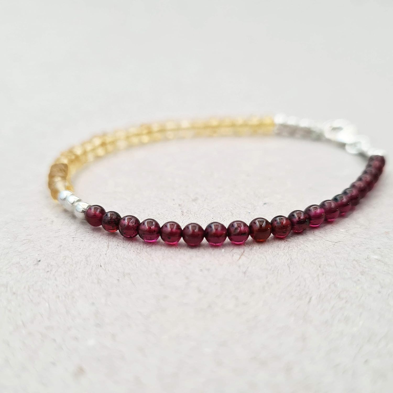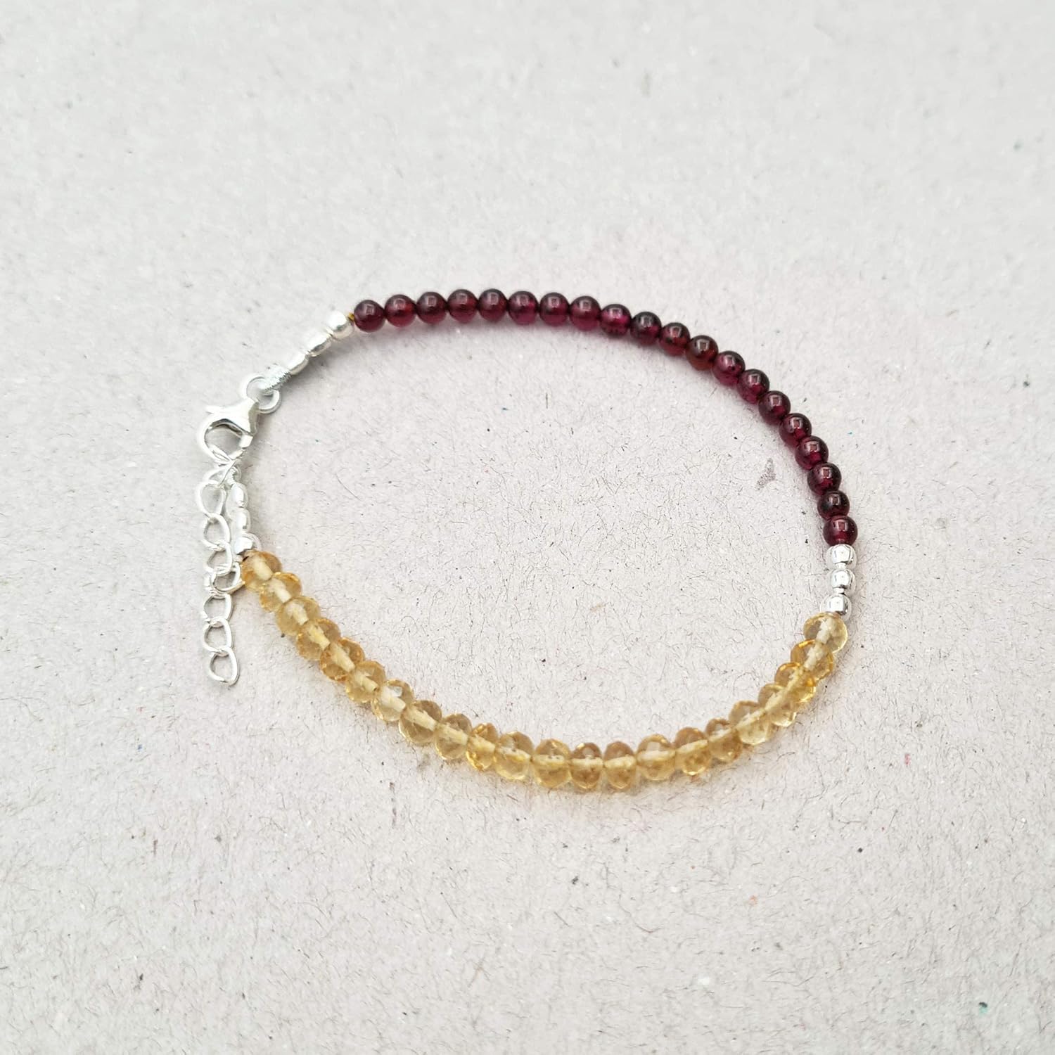 This bracelet features natural roundel Citrine & round Garnet beads with Sterling Silver chain and clasp. The beads measures approximately 3.50-4 mm in size and the length of the bracelet is 6.50-8 inches with the extension chain.