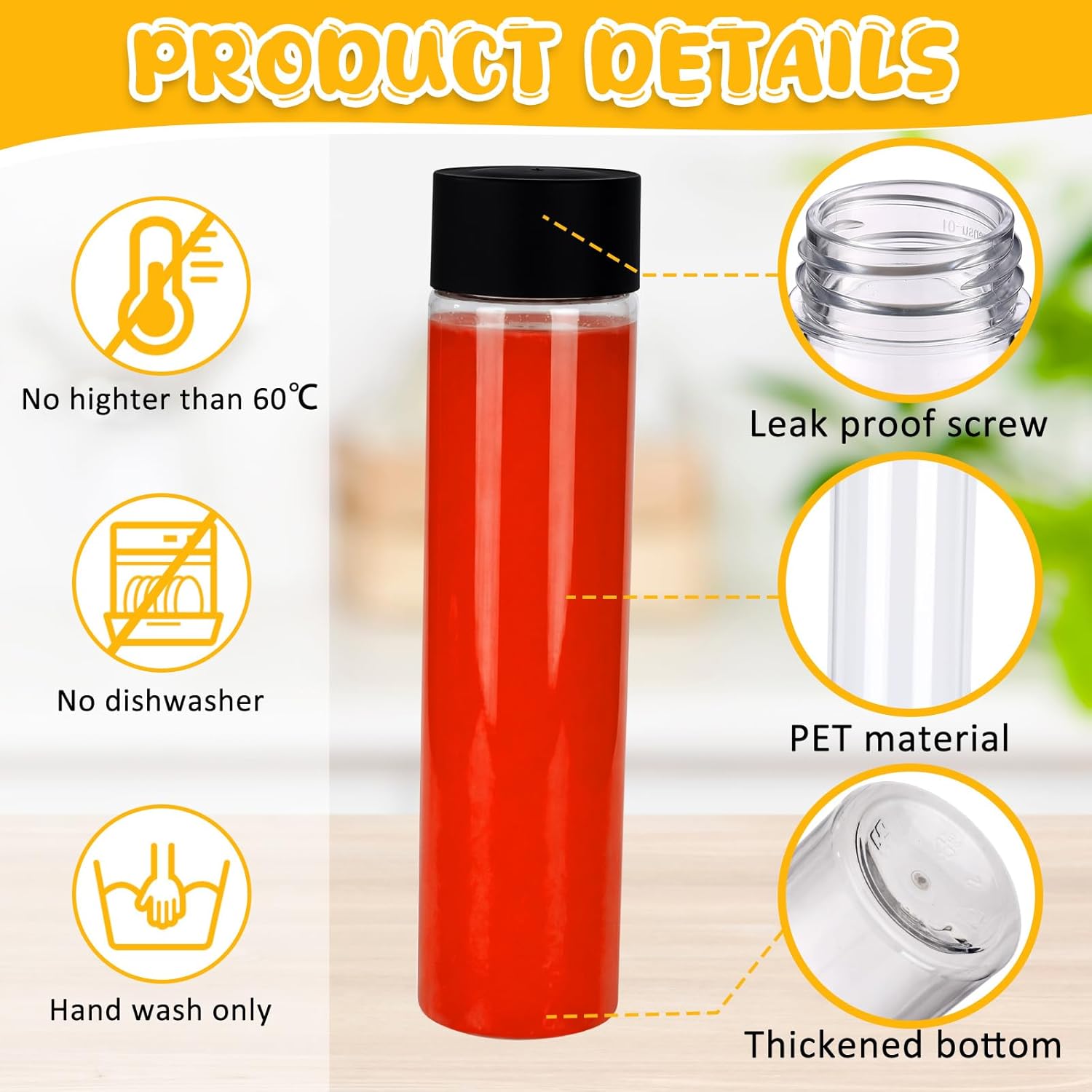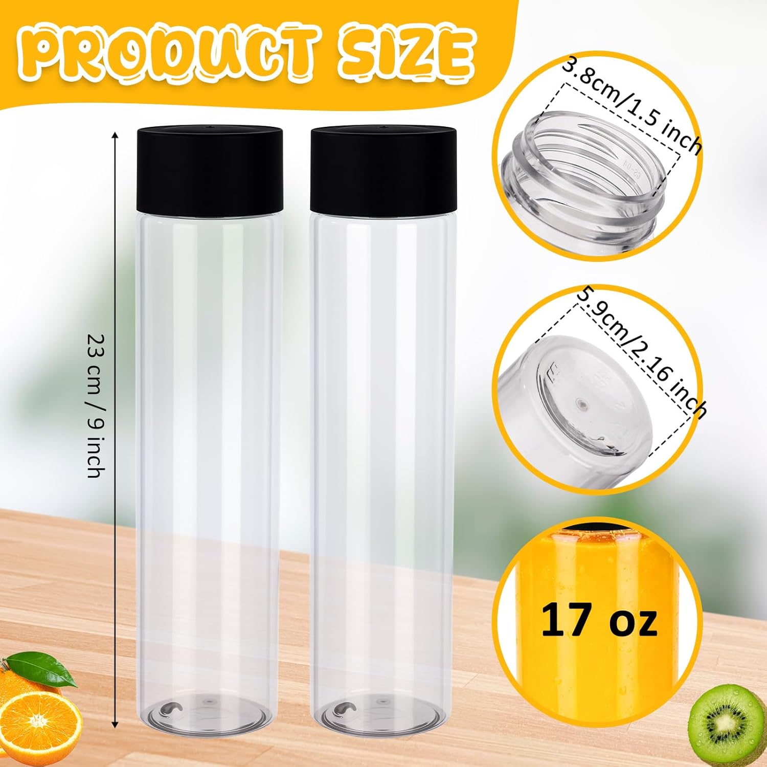 Features: The round plastic bottle set has cylindrical cup body, easy for you to hold and put stably, the lightweight design helps to carry, you can put it into your bag when you go out. The round water bottle is transparent, and the food inside can be clearly seen, this will increase your appetite, providing you a special using experience. Can be applied as a sensory bottle. Plastic water bottles make great sensory bottles, the round shape of the bottle is great for a craft comfort bottle or a sensory bottle in the classroom. Clear PET bottles can shows the contents color. Specifications: Material: PET Quantity: 50 Color: transparent Capacity: 17 oz (500 ml) Size: Height: 9.06 inch/ 230 mm Opening size: 1.5 inch/ 38 mm Bottom diameter: 2.17 inch/ 55 mm Package Includes: 50 x Clear plastic drink containers with black caps Notes: These bottles are not suitable for hot liquid as PET plastic does not tolerate high heat about more than 60 degrees Celsius. These bottles should be hand washed and are not dishwasher safe. Manual measurement, there may be slight differences in size