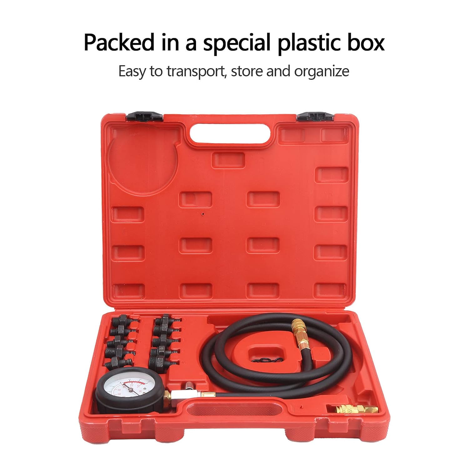 1. General purpose, the oil pressure gauge is equipped with a quick coupling adapter and a 1200mm long hose. Used to test oil pump pressure and low oil warning device. 2. The oil pressure gauge kit includes a 90‑degree coupling adapter for limited access applications. 3. It is helpful to diagnose oil pump and engine wear and oil pressure failure. With switch and pressure warning indicator. 4. The shockproof double scale gauge is used to check the oil pressure quickly and accurately, which is convenient and quick. 5. This oil pressure test tool is packed in a special plastic box for easy transportation, storage and organization. Specification: Item Type: Engine Oil Pressure Test Tool Kit Material: Stainless Steel+Rubber Specification: Adapter R 1/8in 2999 Adapter 1/8in x 27 NPT Adapter 1/4in x 18 NPT Adapter 3/8in x 20 UNF Adapter 1/2in x 20 UNF Adapter M10 Adapter Adapter Adapter M16 Adapter L: 90° Elbow Package List: 1 x Oil Pressure Test Tool Kit (12pcs) 1 x Toolbox 1 x Manual 9 x Rubber Ring