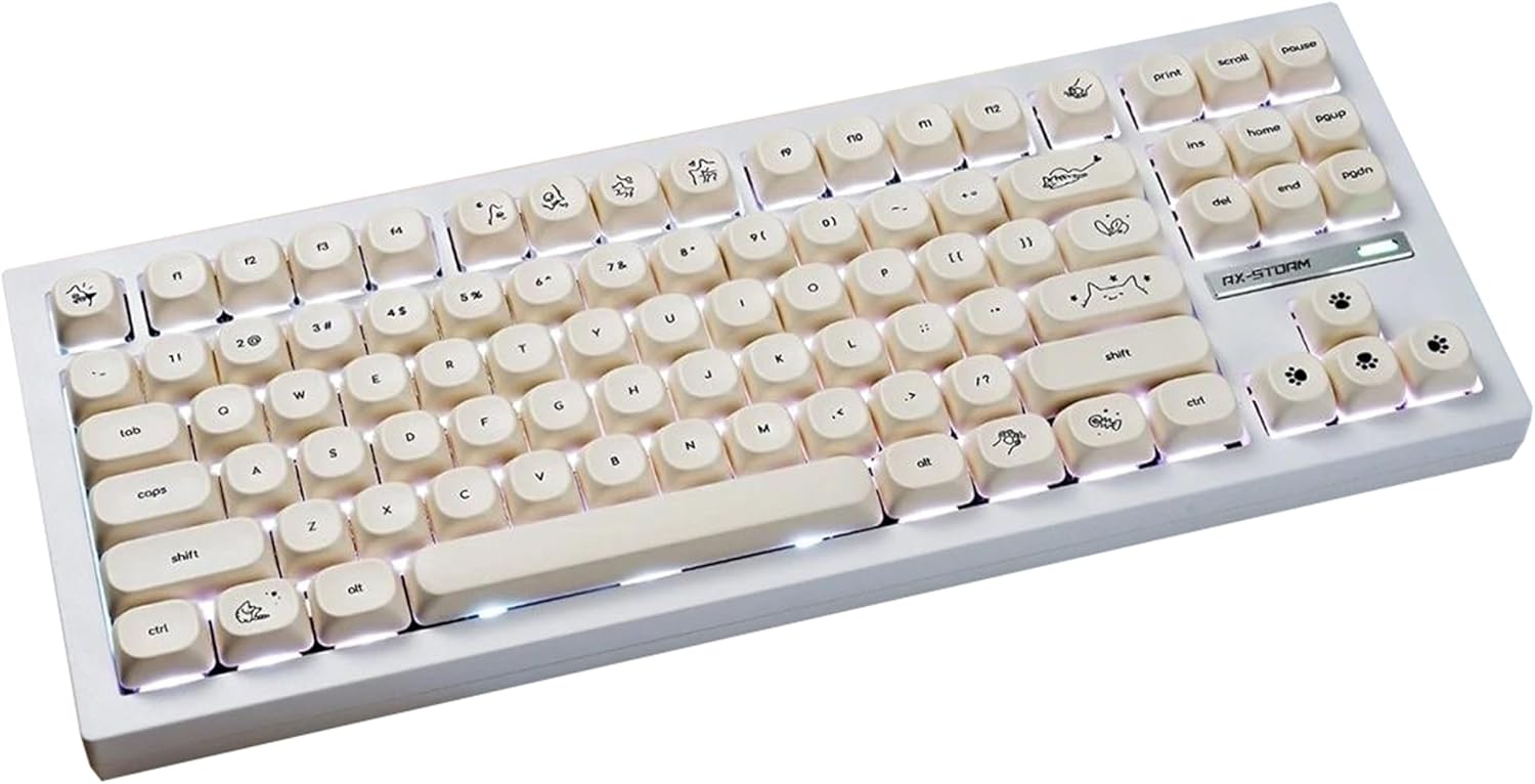 Package Included: 1x 124 key Keycaps+Keycap Puller Not incluede keyboard PBT Material: This keycap is made of high quality PBT key material, with matte texture and wear resistance. MOA Profile Keycaps: MOA profile keycap edge line more rounded, better fit with the finger. Dye Sub: The pattern on the keycap adopts dye sublimation technology, and the pattern will never fade. Compatible: Compatible with most 61 64 67 68 84 87 96 104 108 Mx mechanical keyboard whose spacebar is 6.25u,around 4.61 inches. It can't use with low profile mx keyboard.The big keys may stuck for stabilizers height issue. It can't be compatible with Cosair Logitech Razer Keyboard. It can't use for some old Cherry brand keyboard whose caps lock back hole is off center,such as 1800. Please note:If your keyboard led is in the north,the led effect will be not good.However it can mount on to type without problem.South-facing LED is more suitable for this keycap.